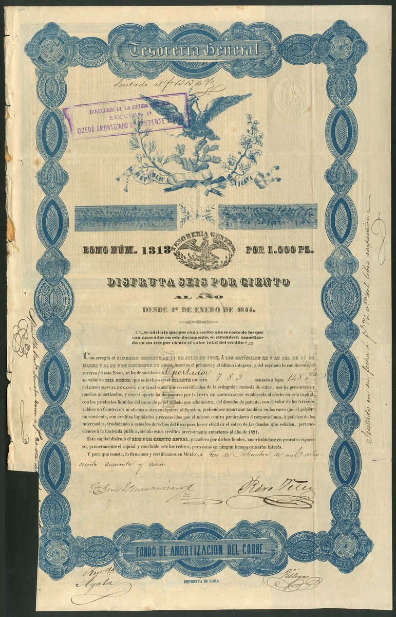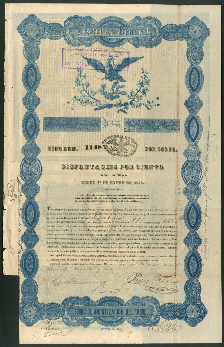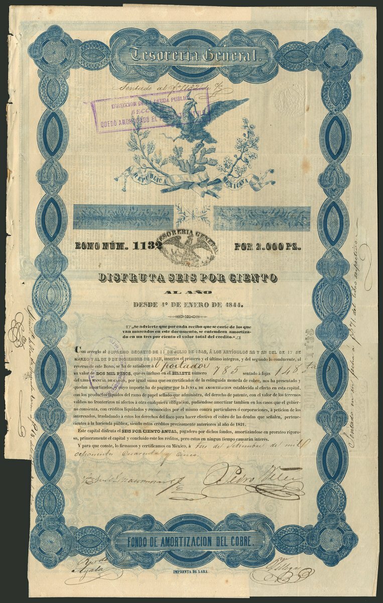 Mexico: 1844 6% Internal Treasury Loan, a trio of bonds for 500 pesos, #1148, 1000 pesos, #1313 and 2000 pesos, #1132, large format, eagle at top, blue, with coupons, hole cancelled. Folds with minor splitting, better than average, VF (3).