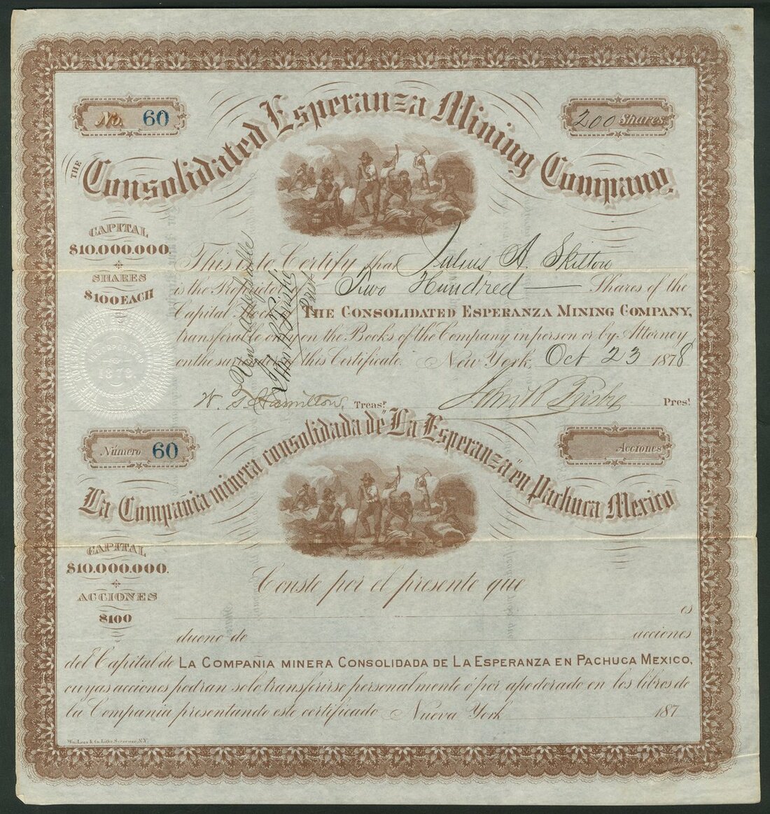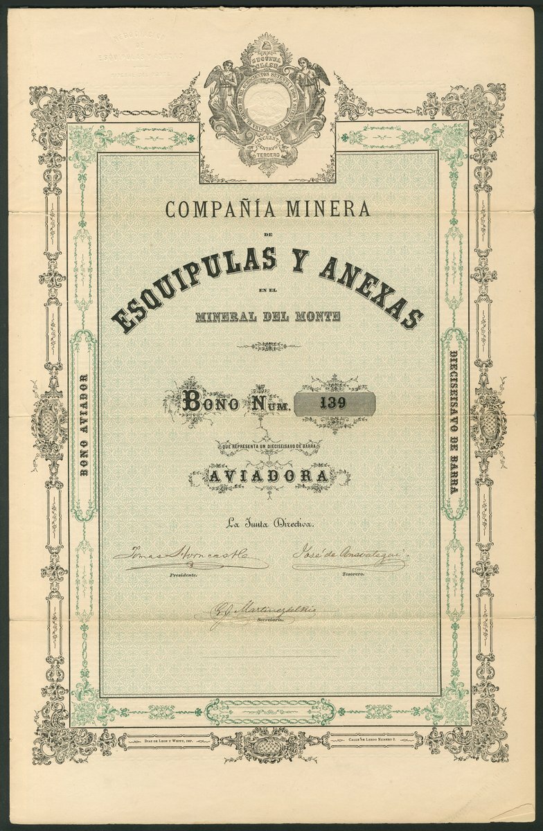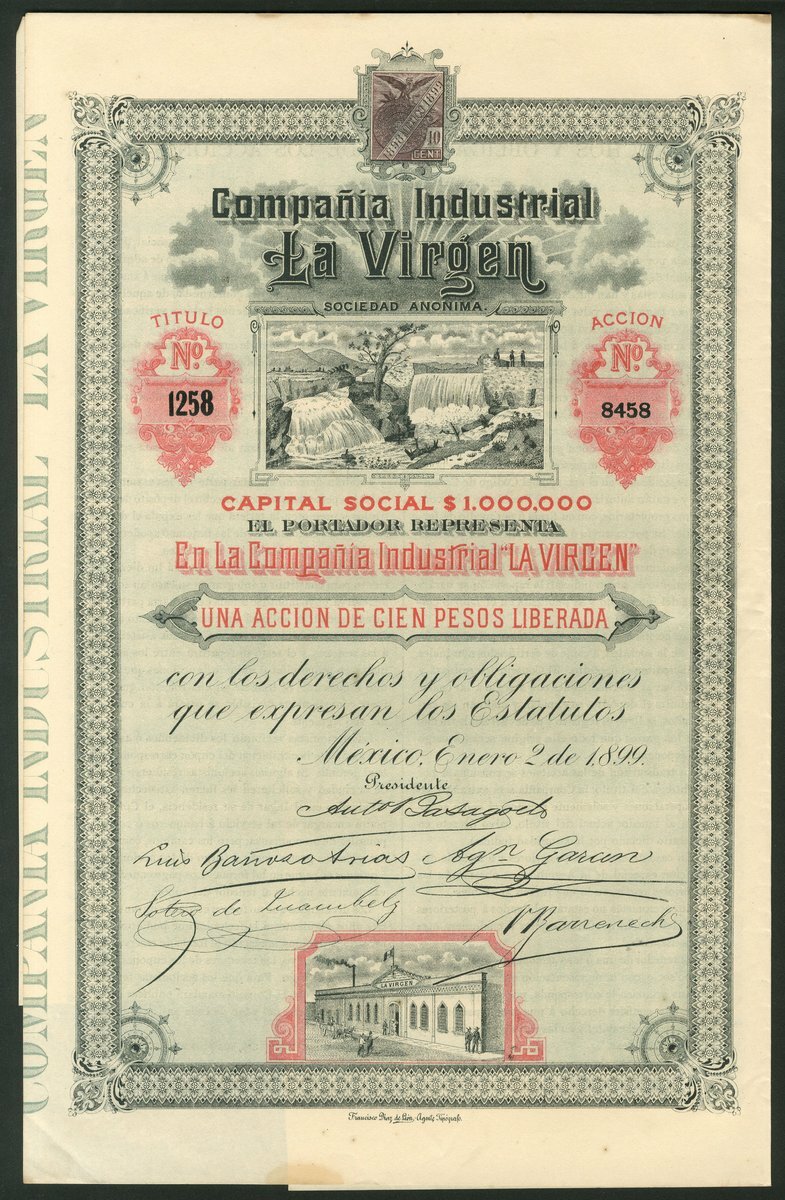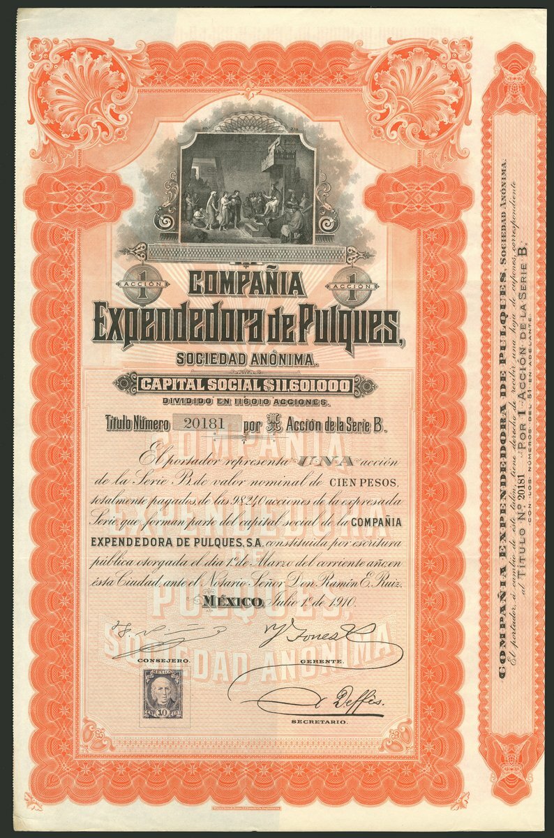 Mexico: A small group of certificates, comprising Compañia Minera de Esquipulas y Anexas en el Mineral de Monte, bono aviadora, circa 1872; Compañia Industrial La Virgen, 100 peso share, 1899, #8458, vignette of waterfall; Consolidated Esperanza Mining Company, $100 shares, 187[8], brown, miners at work, and, Compañia Expendedora de Pulques, 1 share, 1910, #20181, drink being offered to the king. The first with minor splitting otherwise VF and better (4).