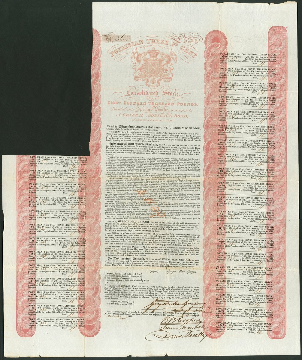 Poyais: Poyaisian 3% Consolidated Stock, £250 bond, 1827, #363, handsigned by Gregor MacGregor, coat of arms at top, pink and black, with coupons. VF.