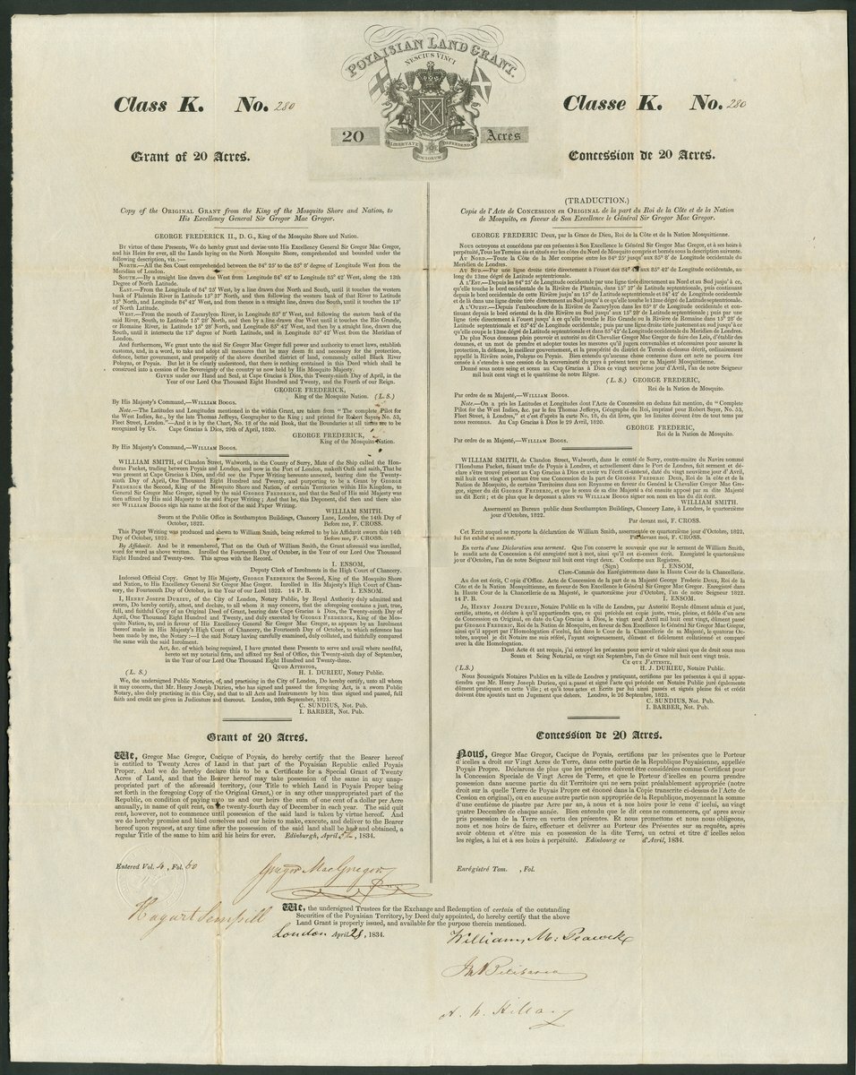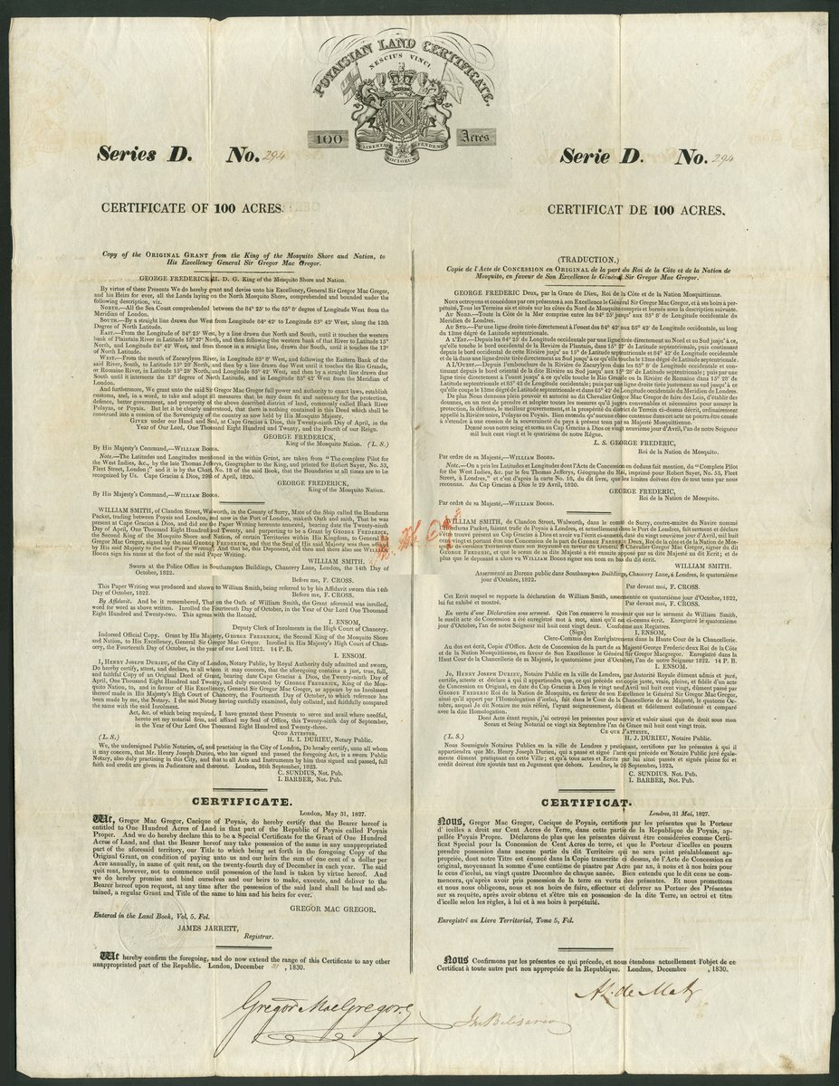 Poyais: A pair of Land Grant certificates comprising, 100 acres, 1830, series D, #294, and 20 acres, 1834, Class K, #280, both similar in design with coat of arms at top, both handsigned by Gregor Macgregor, black.