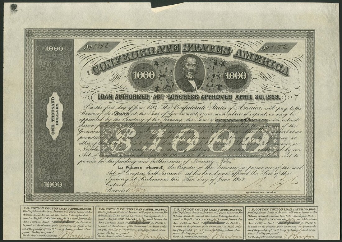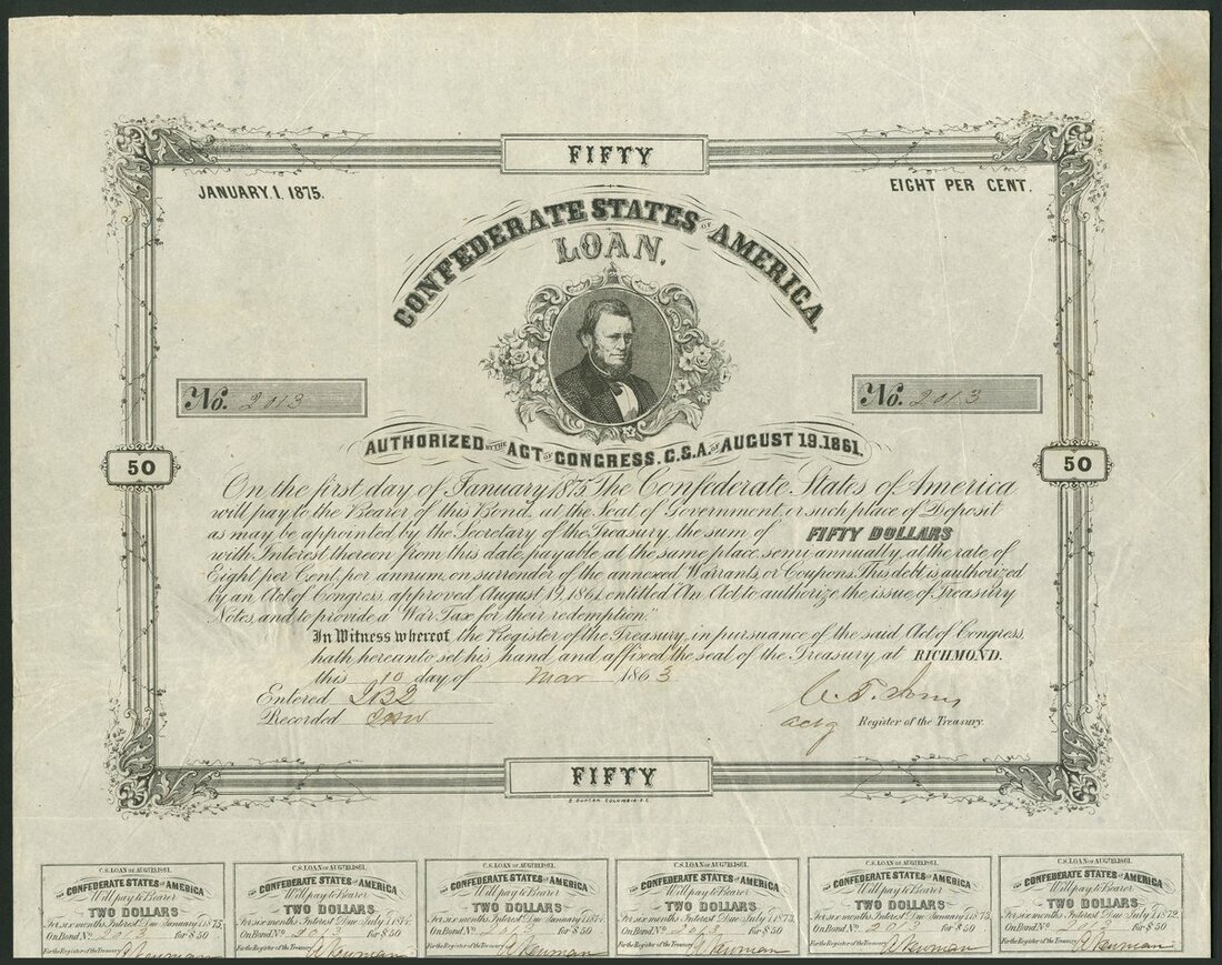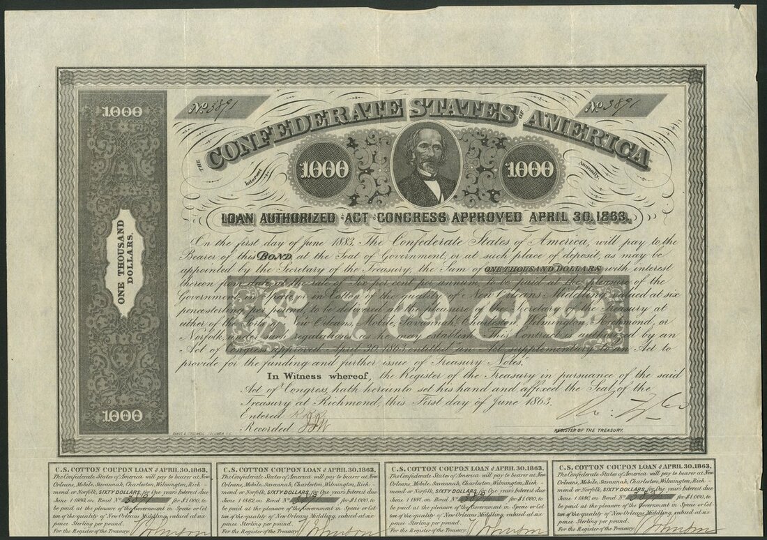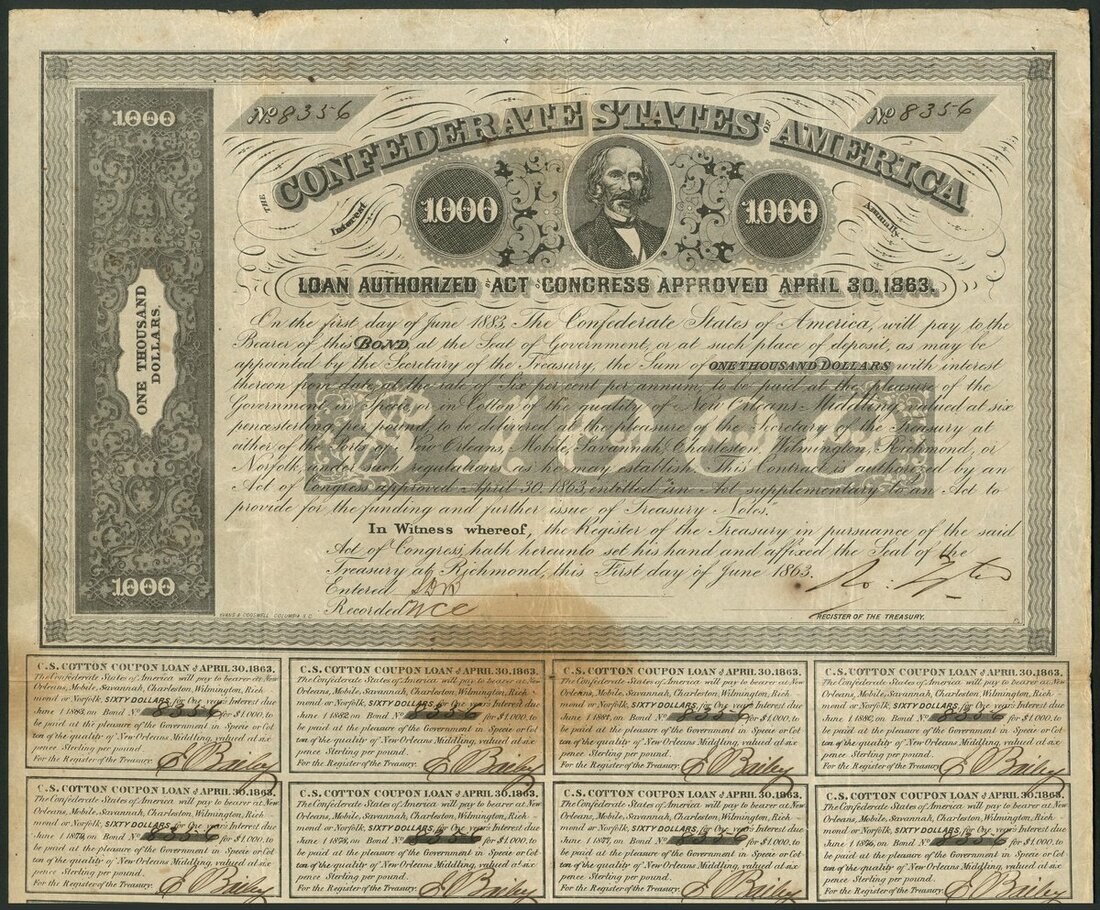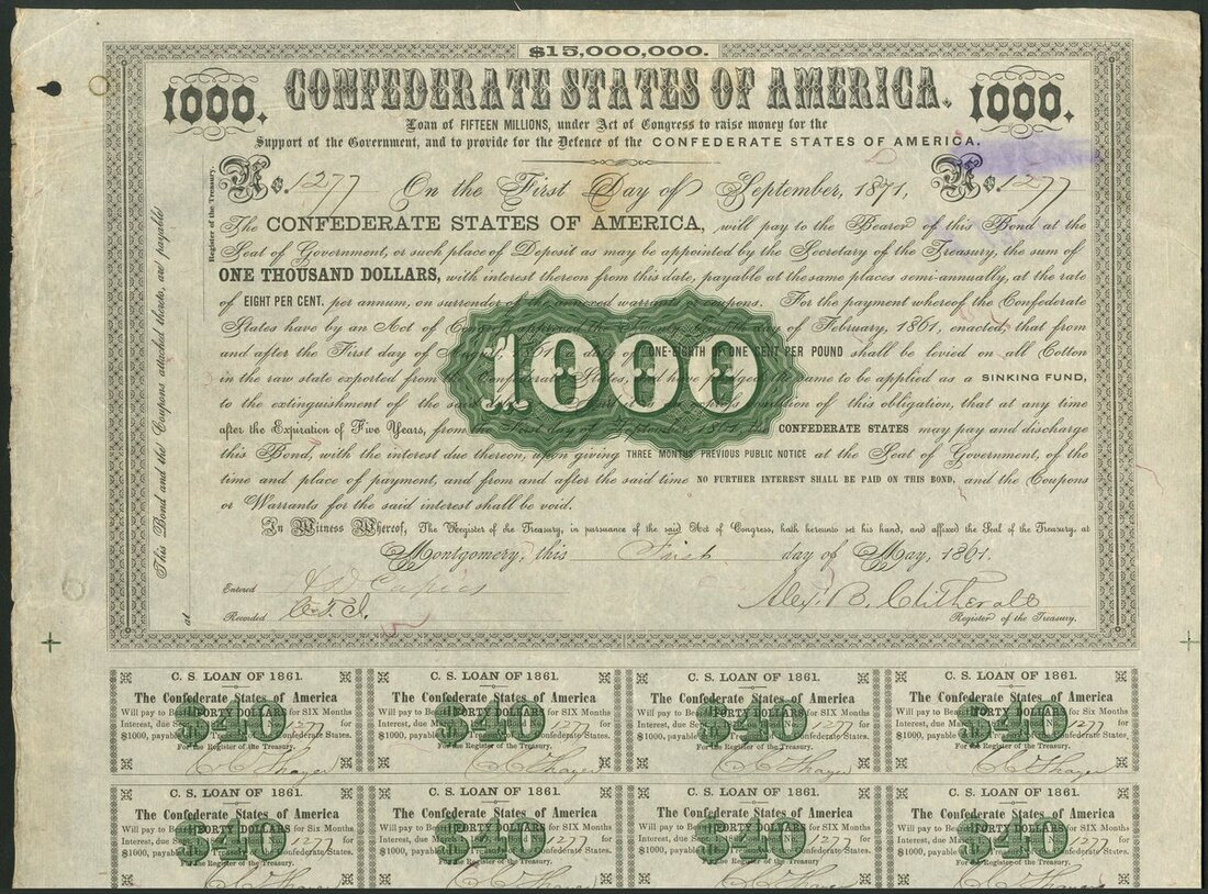 Confederate States of America: A group of 11 bonds, comprising $1000, 1861, '1000' in centre; $50, 1863, Thomas Bragg in centre; $500, 1863, Customs House; $1000, 1863, James A. Seddon, 3 examples; $100, 1864, First Series, $1000, 1864, First Series and $1000, 1864, 5th Series, all with Washington equestrian statue (Ball 9, 87, 261, 280 x 3, 296, 317 and 329). Mixed condition but mostly AVF (9).