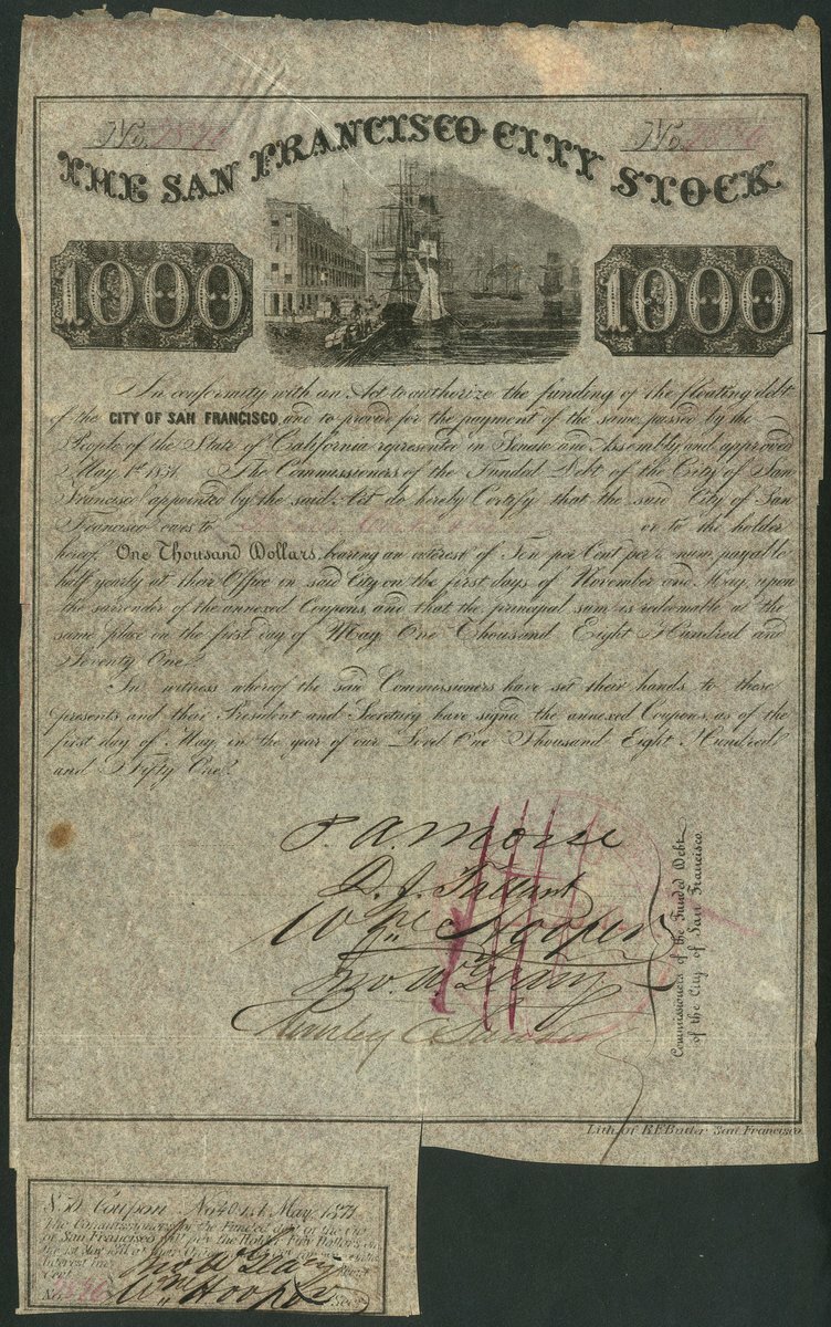 U.S.A.: California: San Francisco City Stock, 1851, certificate for $1000, #2826, small format piece with attractive dockside scene, black, one coupon remains. Ink cancelled through signatures. GVF and rare.