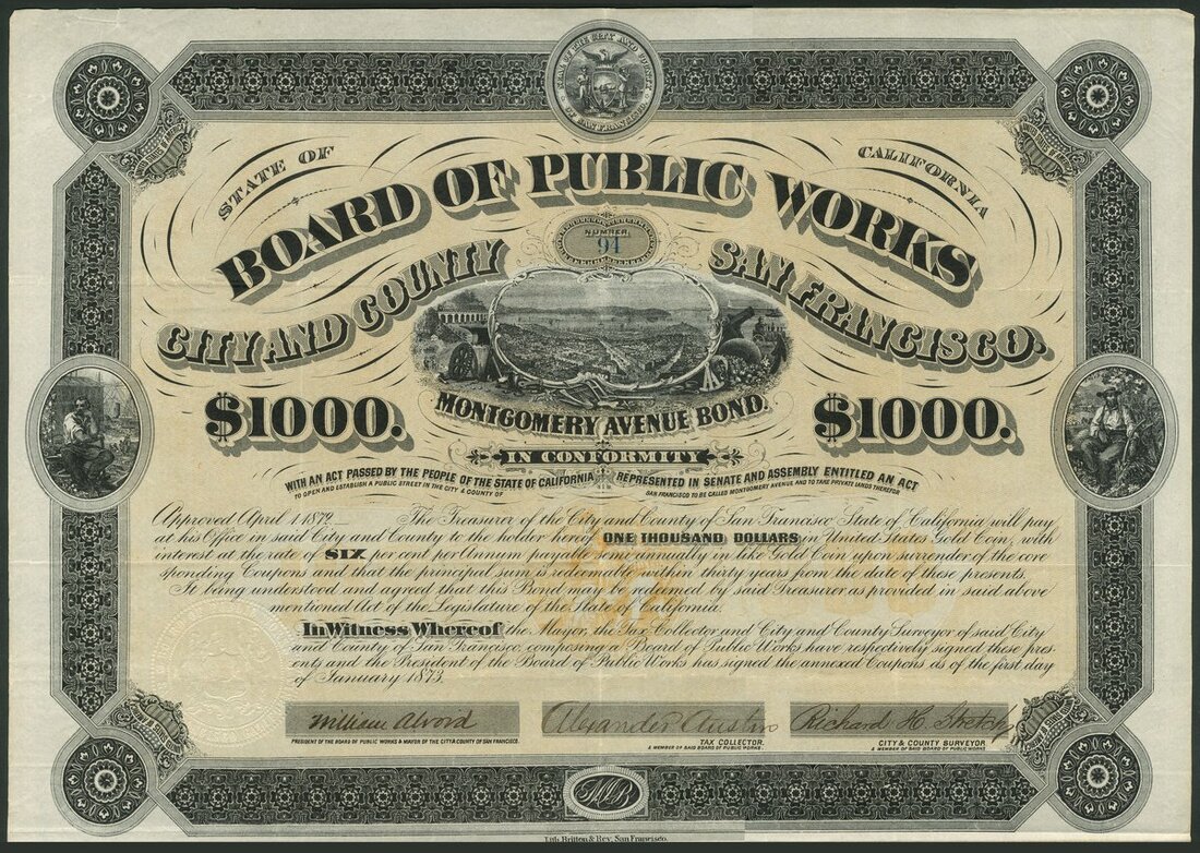 USA: City and County of San Francisco, Board of Public Works, Montgomery Avenue bond, 6%, $1000, 1873, #94, large format piece with vignette of city view in centre, ornate border with vignettes of iron worker and farmer in contemplative poses, black with yellow underprint, with coupons from 1886. GVF and scarce.