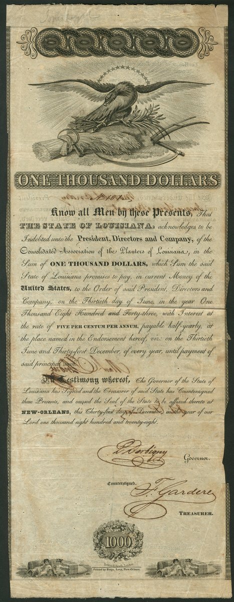 U.S.A.: State of Louisiana, 1828 'Planters' 5% Loan, bond for $1000, #101, eagle at top, black, with associated 1866 certificate regarding the final liquidation of the loan. A small amount of ink burning, VF, the associated certificate with repairs F-VF. Rare(2).