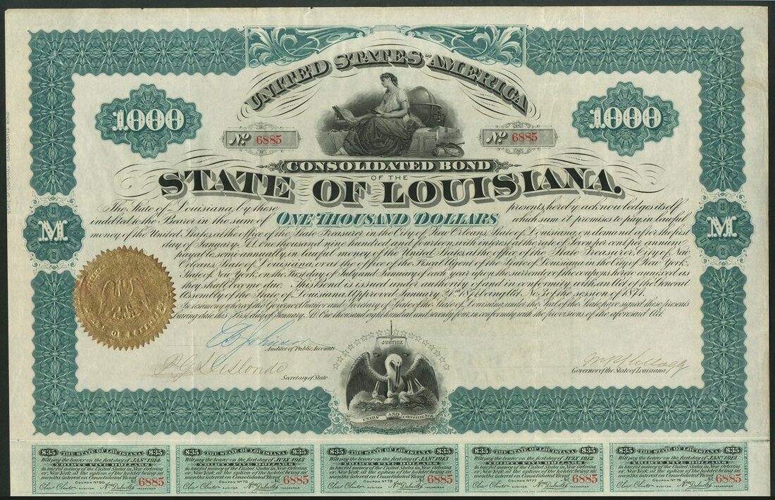 U.S.A.: State of Louisiana, 1874 7% Consolidated Bond, $1000, #6885, signed by Governor William Pitt Kellogg, allegorical figure at top, pelican below, green and black, with coupons. Near EF and scarce.