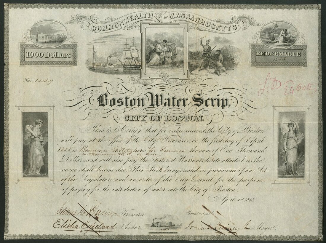 U.S.A.: Massachusetts: City of Boston Water Scrip, 1848, $1000, #1429, redeemable 1858, attractive and scarce piece with numerous vignettes, black. Edges trimmed close otherwise VF.