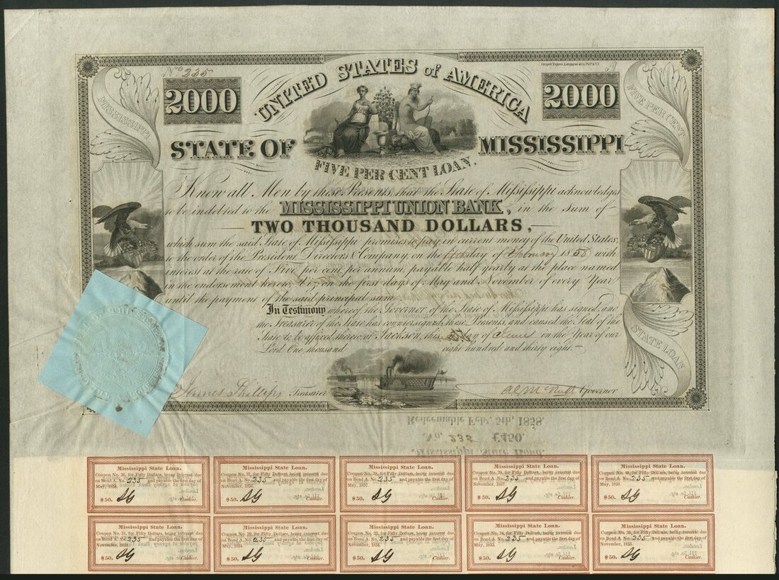 USA: State of Mississippi, 5% 'Union Bank' Loan, 1838, bond for $2000, #235, payable February 1858, attractive early piece with allegorical figures, bald eagle at either side, paddle steamer at bottom, black, blue paper seal, with coupons. AEF.