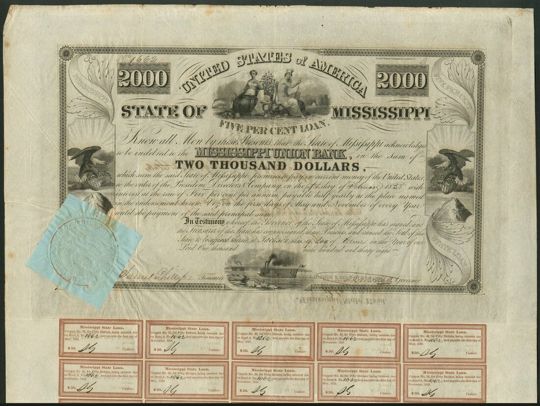 USA: State of Mississippi, 5% 'Union Bank' Loan, 1838, bond for $2000, #1662, payable February 1858, attractive early piece with allegorical figures, bald eagle at either side, paddle steamer at bottom, black, blue paper seal, with coupons. GVF.