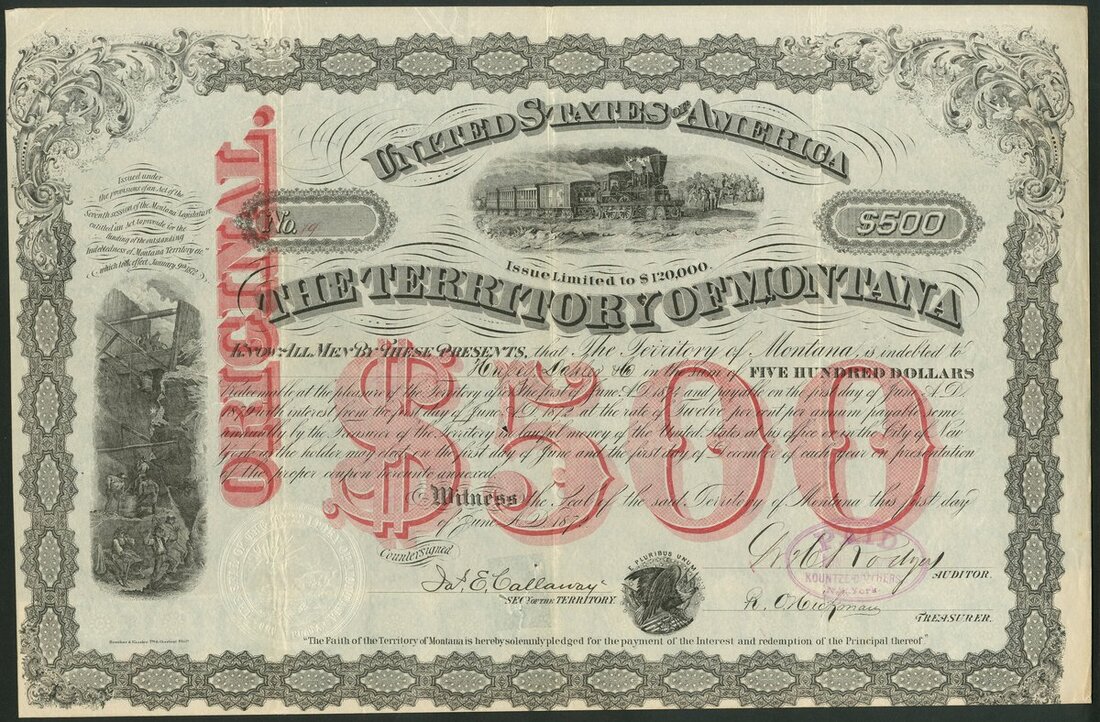 U.S.A: Territory of Montana, 12% Loan, bond for $500, 1872, #19, steam train and native Americans at top, miners underground at left, red and black, with coupons, cancelled. VF and scarce.