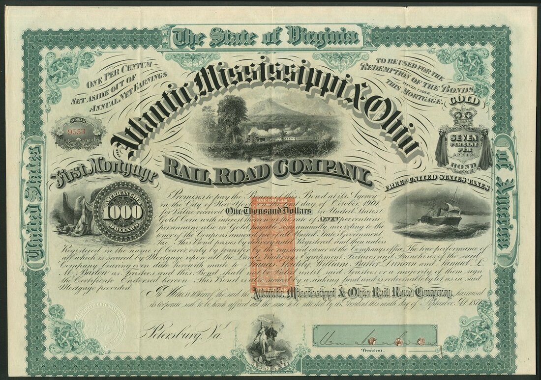 U.S.A.: Atlantic, Mississippi & Ohio Rail Road Company, First Mortgage Gold Bond $1000, 1871, #9553, green, four vignettes with train, ship, eagle and motto of Virginia "Sic semper tyrannis", imprinted revenue stamp RN-W2, signed by the former Confederate General William Mahone (1826-1895) as President. Cancelled, VF.