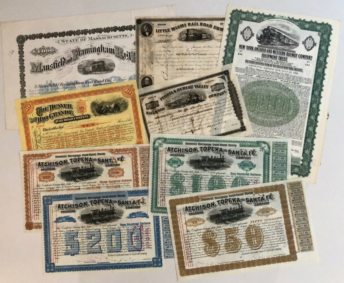 U.S.A.: A group of Railroad stock certificates and bonds, comprising Denver & Rio Grande Railroad, 1902; Mansfield and Framingham Rail Road Co., $1000, 1871; Little Miami Rail Road Co., 1853; New York, Ontario and Western Railway Co., $1000, 1929; Peoria & Bureau Valley Railroad Co., 1855; and others (9). See images for details. VF and better (14).
