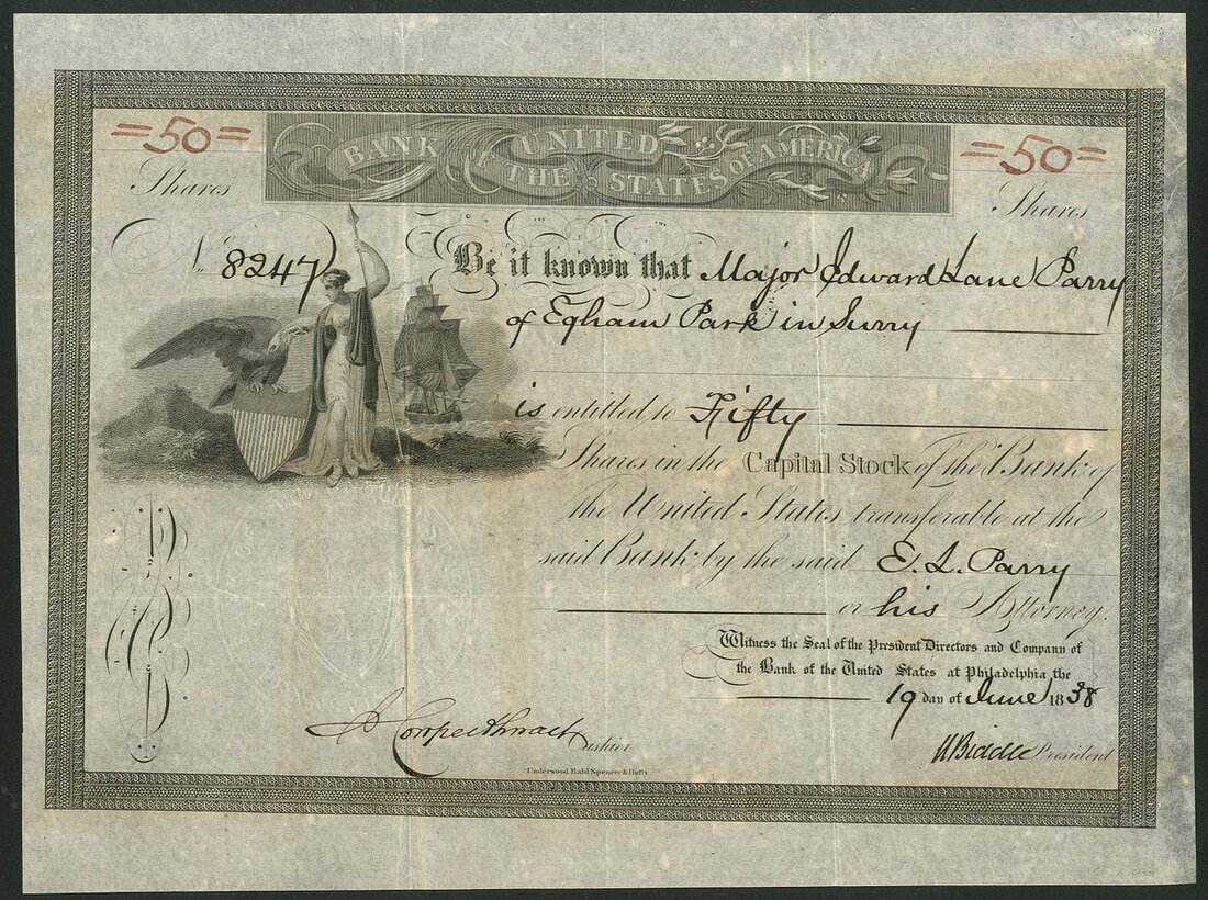 U.S.A.: Bank of the United States of America, certificate for [50] shares, issued to Major Edward Lane Parry, of Surrey, 18[38], #8247, signed by Nicholas Biddle as President, Liberty with US shield and eagle, sailing ship behind, ornate border, black. VF and scarce.