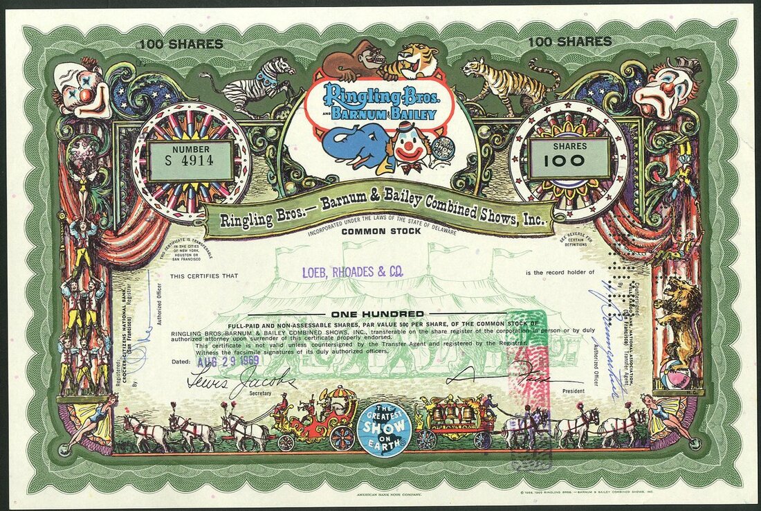 U.S.A.: Ringling Bros. - Barnum & Bailey Combined Shows, Inc. 100 shares common stock, [1969], #S4914, very ornate multicoloured piece with clowns and various circus animals, cancelled. EF.