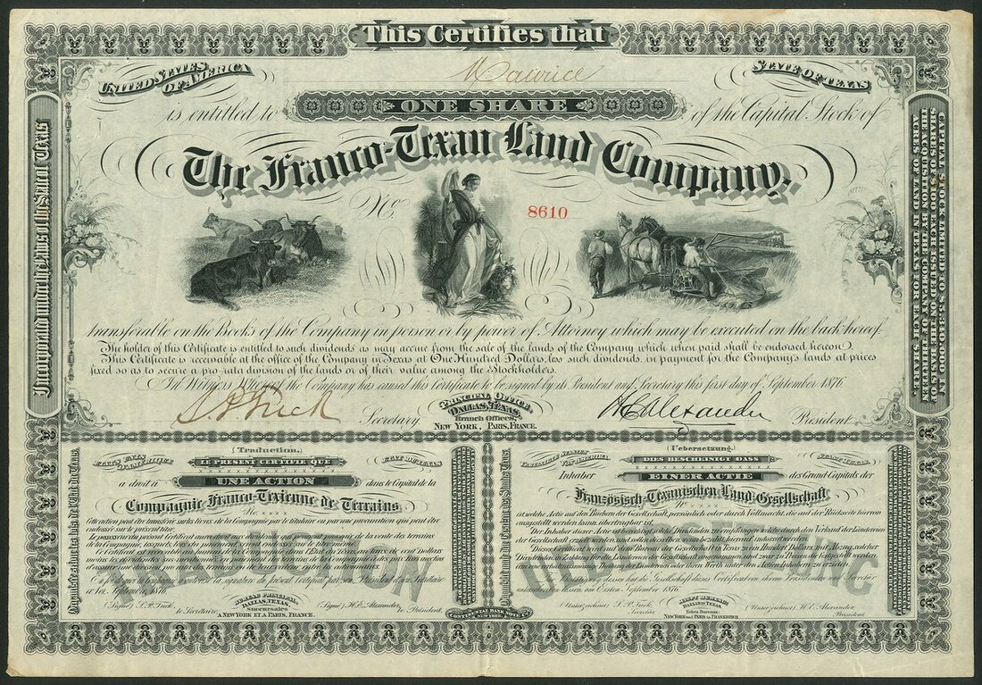 U.S.A.: Franco-Texan Land Company, one share of $100, 1876, #8610, agricultural scenes, black, text also in French and German.
