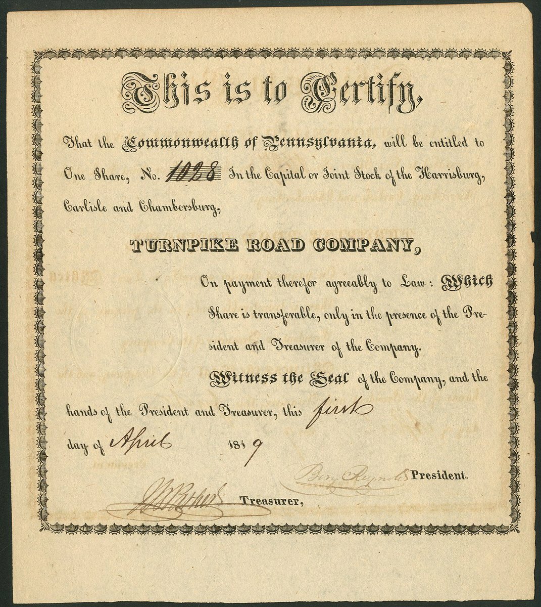 U.S.A.: Harrisburg, Carlisle and Chambersburg Turnpike Road Company, one share, 181[9], #1028, ornate border, black, embossed seal. AEF and better than most of this issue, many of which are very brittle with edge tears.