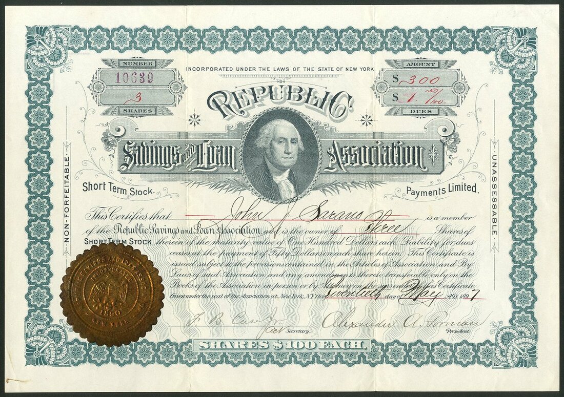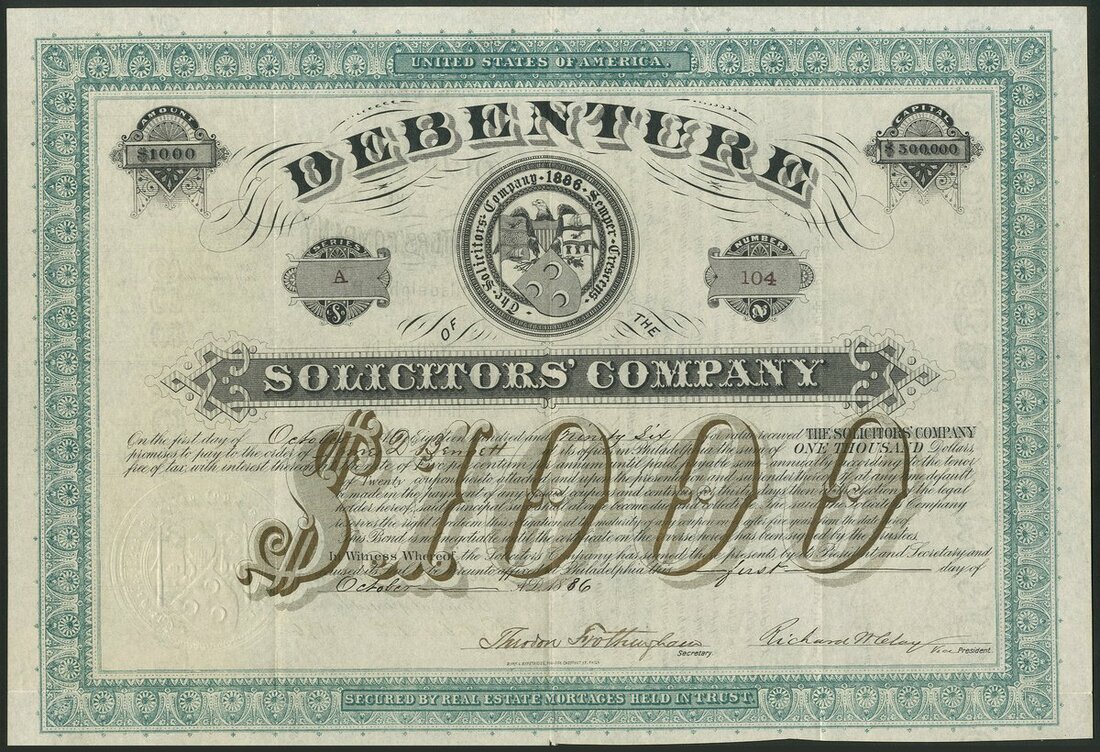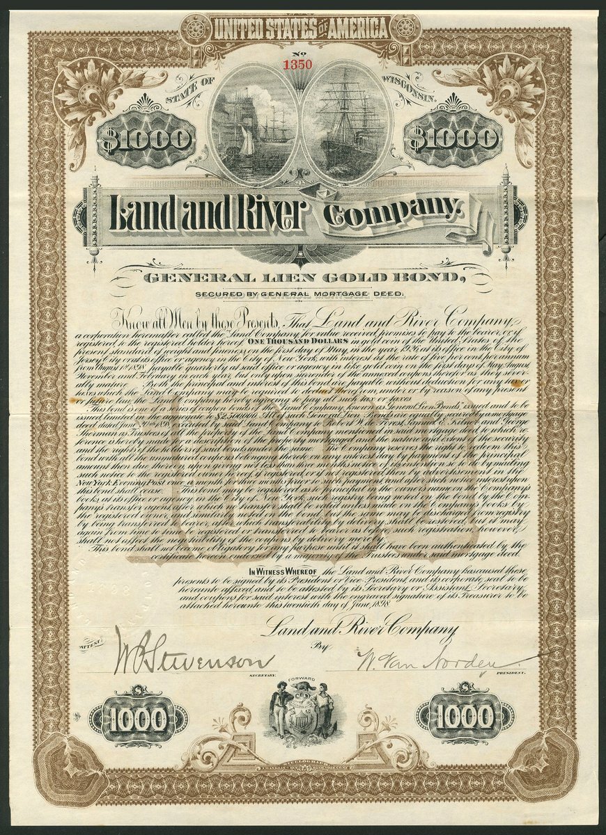 U.S.A.: Three 19th Century certificates, comprising Land & River Company, Wisconsin, General Lien Gold Bond, $1000, 1898, #1350, shipping vignettes at top, brown and black, with coupons; Republic Savings and Loan Association, New York, short term stock, 189[7], #10639, Washington in centre, green and black, and, Solicitors' Company, $1000 debenture, 18[86], #A104, arms in centre, green and black, gold underprint, with coupons. All VF-EF (3).