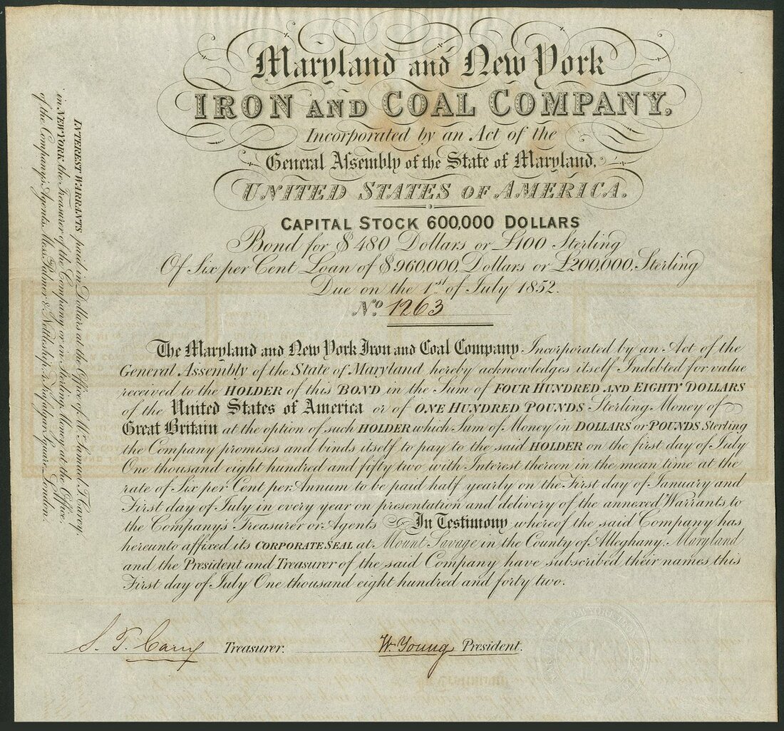 Maryland and New York Iron and Coal Company (MD), 6% bond for $480 or £100, 1842, #1263, black, with coupons, two of which have been paid. The Company was incorporated in 1837 with a capital of $1,000,000 to establish a plant at Mount Savage, Maryland to manufacture and smelt iron out of local ores. The company was founded by an Englishman and much of the stock was held in England. The United States government was also to become one of the largest stock holders. Also the first company to produce iron rails in America. Operations ceased in 1847. VF-EF and scarce.