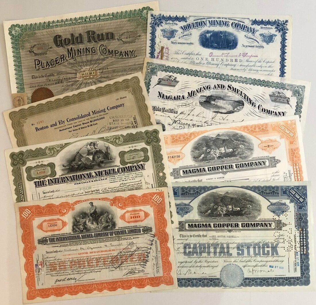 U.S.A.: A group of mining and other certificates, many modern but includes Niagara Mining & Smelting, 1890, Gold Run Placer Mining Co., 1902. Many modern certificates. See images for details. Many VF and better - NO RESERVE (45).