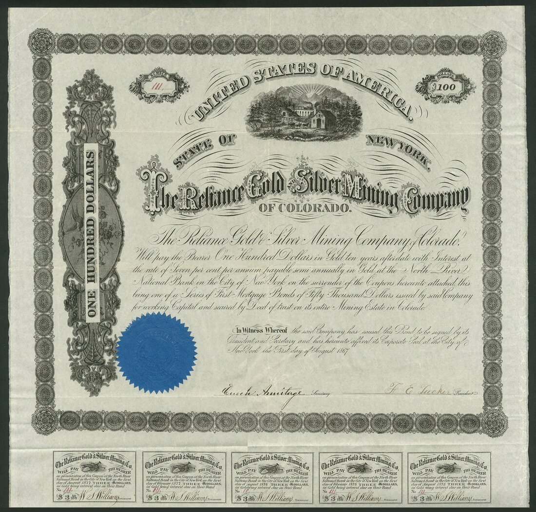 U.S.A.: Reliance Gold & Silver Mining Co. of Colorado, 7% bond for $100, 1867, #111, large format piece with vignette of mine entrance and building, black, red seal, with coupons. GVF.