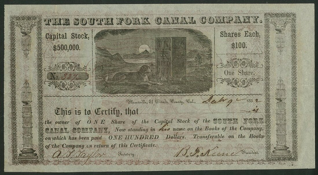 U.S.A.: South Fork Canal Company, California, $100 shares, 185[2], #327, dog and safe in centre, black, mauve underprint on very flimsy paper. An important company incorporated in 1852 to build ditches and flumes to supply the hydraulic mines with water. EF.