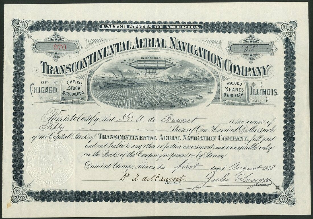 U.S.A.: Transcontinental Aerial Navigation Company, $100 shares, Chicago 188[8], #970, signed by Dr. A. De Bausset as president. Vignette of Bausset's airship at top, black. The Bausset airship was not to be the usual type filled with gas but with a steel frame in which a vacuum was created causing the craft to lift! AEF and scarce.