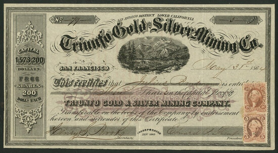 U.S.A.: Triunfo Gold & Silver Mining Co., San Antonio District (CA), $200 shares, San Francisco 186[4], #79, vignette of mine site below title, ornate border, black with purple underprint. GVF.
