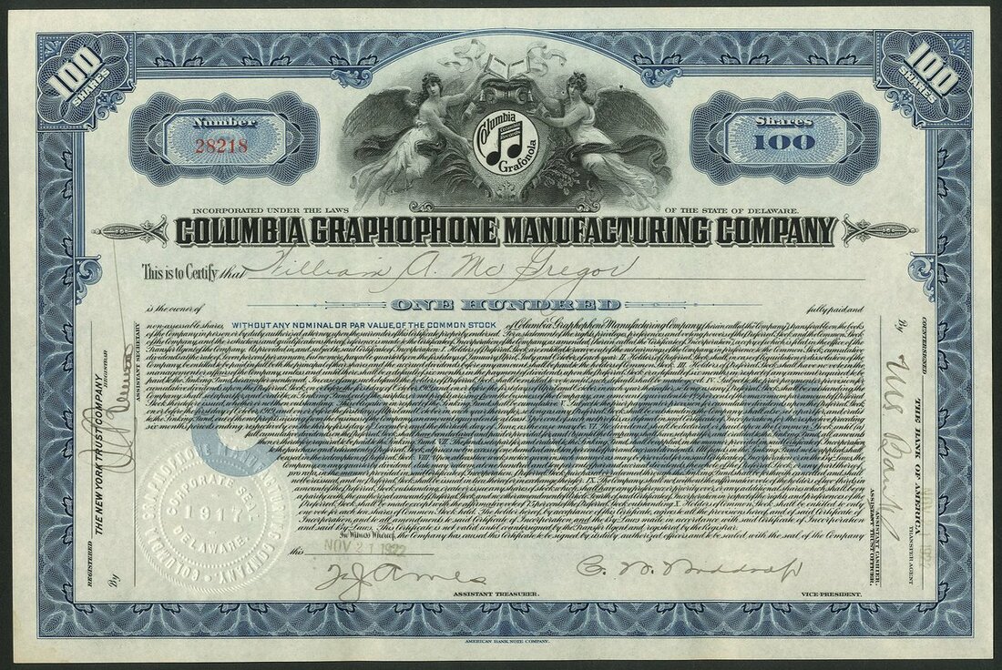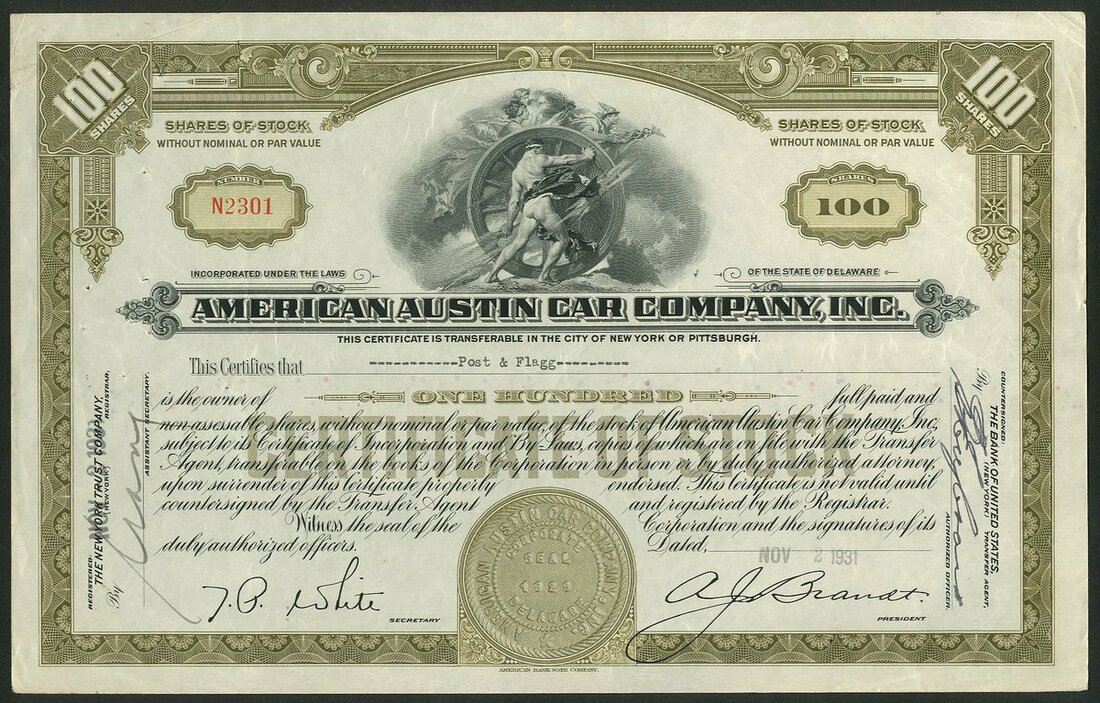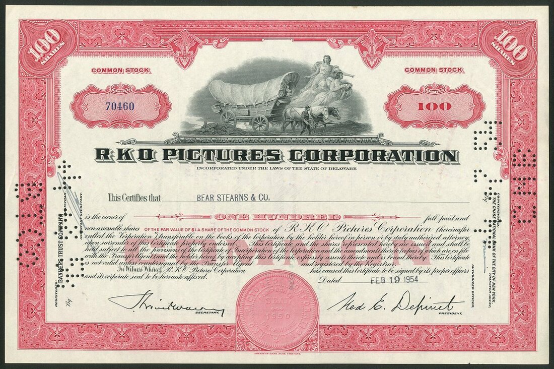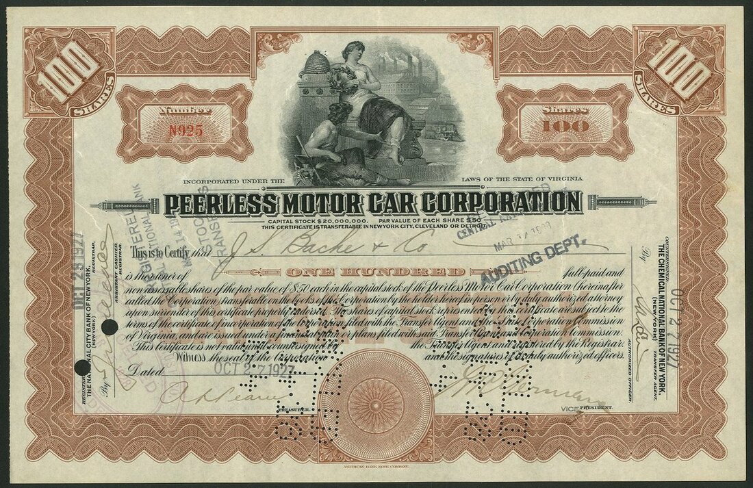 U.S.A.: A miscellaneous selection of certificates, comprising American Austin Car Company, 100 shares, 1931, Peerless Motor Car Corporation, 100 shares, 1927 and less than 100 shares, 1929, Columbia Gramophone Manufacturing Company, 100 shares, 1922, RKO Pictures Corporation, 1954, Wells fargo Bank American Trust Company, specimen, less than 100 shares, and others (5). VF and better (11).