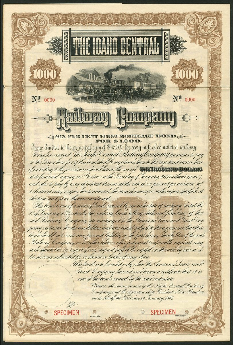 U.S.A.: Idaho Central Railway Company, 6% First Mortgage Bond, 1887, a specimen $1000 from the ABNCo. archives, steam train at station at top, brown and black, with coupons, overprinted SPECIMEN in red. Some minor splitting at folds, small tear at right, but VF and rare.