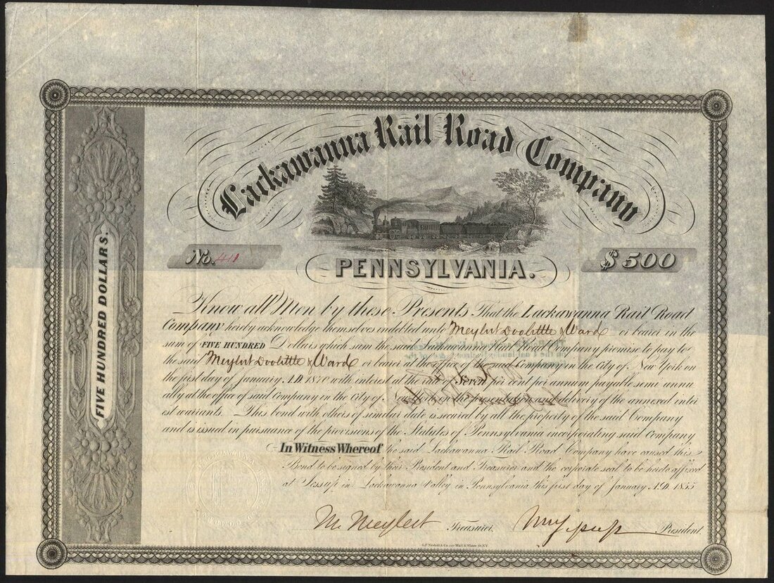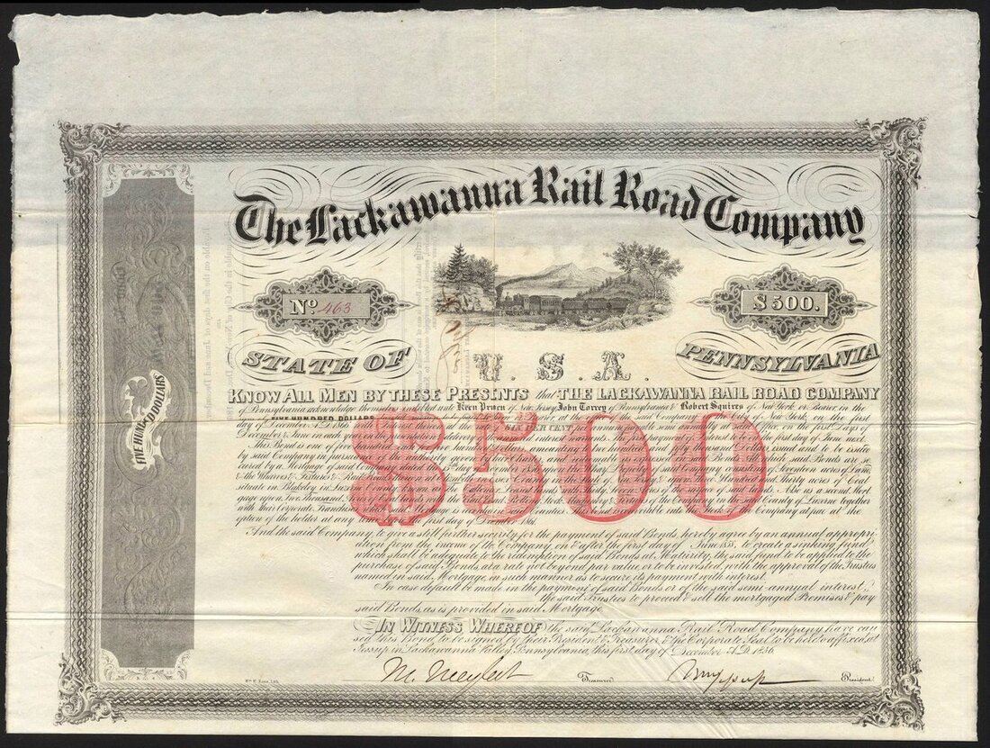 U.S.A.: Lackawanna Rail Road Company (PA), 6% Mortgage Bond, 1856, $500, #463, of only 500 issued, large format, steam train passing through countryside, black, red underprint '$500', printed by Wm W Rose, with coupons; together with 7% Mortgage bond, $500, 1855, #411, same vignette as the above, black, with coupons. Both are signed by Morris Jessup as President. Jessup, 1830-1908, was a banker and philanthropist, one of the founders of the YMCA. President of the American Museum of Natural History. Both VF, the first scarce (2).