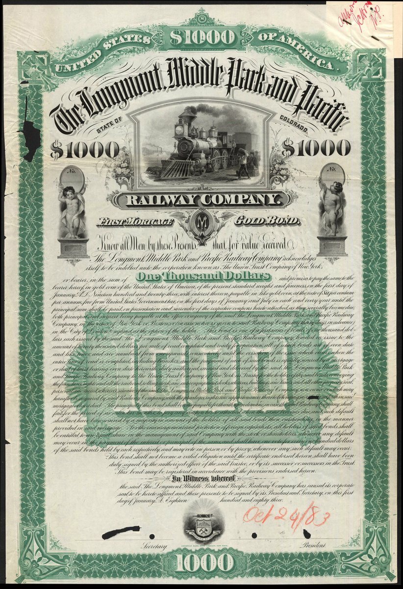 U.S.A.: Longmont, Middle Park and Pacific Railway Co. (CO), a proof first mortgage gold bond for $1000, from the ABNCo archive, 1883, not numbered, steam train at top, cherubs at sides, ornate border, green and black, along with coupons and miscellaneous papers. Probably unique and not in Cox. Large tear top left with small piece missing in border, otherwise VF.