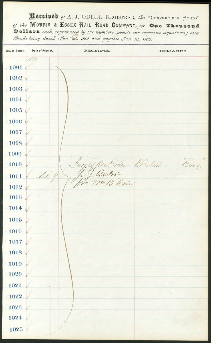 (x) U.S.A.: Morris and Essex Rail Road Company, a receipt for 25 bonds of $1000 each dated 1869, the property of William B Astor and signed by J.J.Astor on his behalf. Folio sheet showing bond numbers 1001-1025, black printing, clear signature. John Jacob Astor III (1822-1890), grandson of John Jacob Astor and son of William Backhouse Astor, lost control of the New York Central system to the Vanderbilts but concentrated on the family's vast land holdings in New York State. EF.