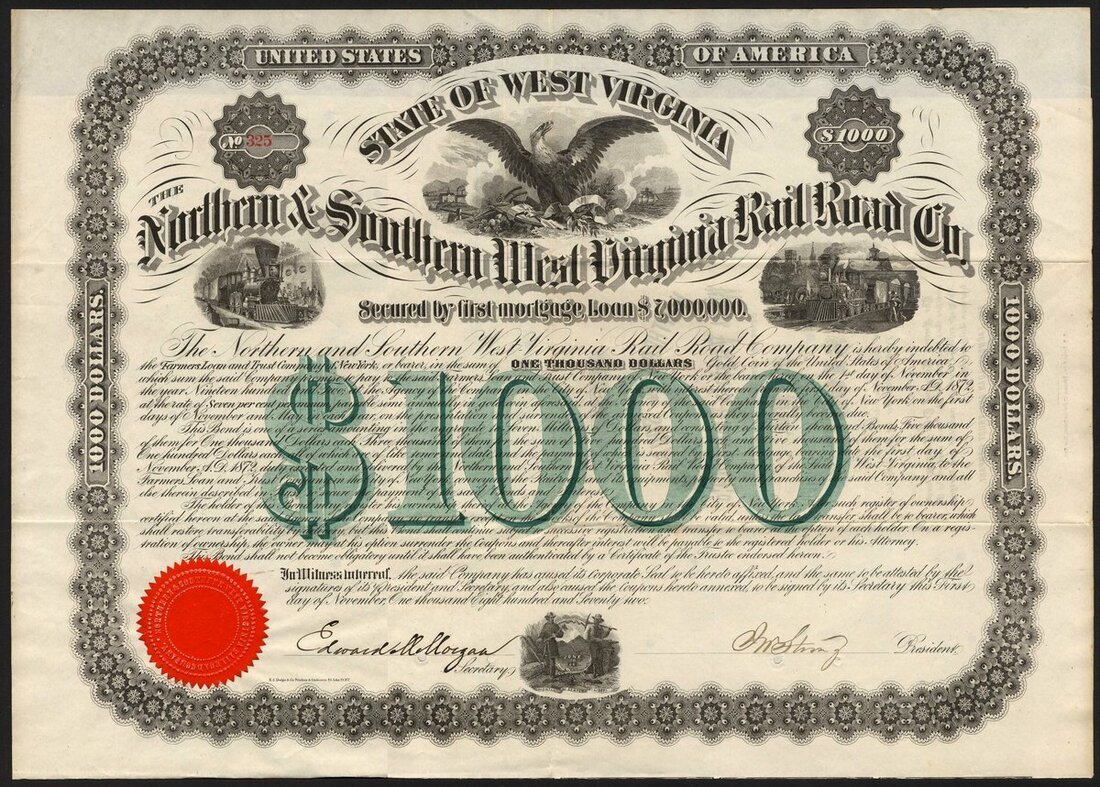 U.S.A: Northern & Southern West Virginia Rail Road Co., First Mortgage bond for $1000, 1872, #325, large format piece with vignettes of steam trains and bald eagle, black, blue underprint, red seal, with coupons. Formed in 1872 with plans to join the coal rich area with the Pennsylvania and New York systems. Failed in the panic of 1873. VF.