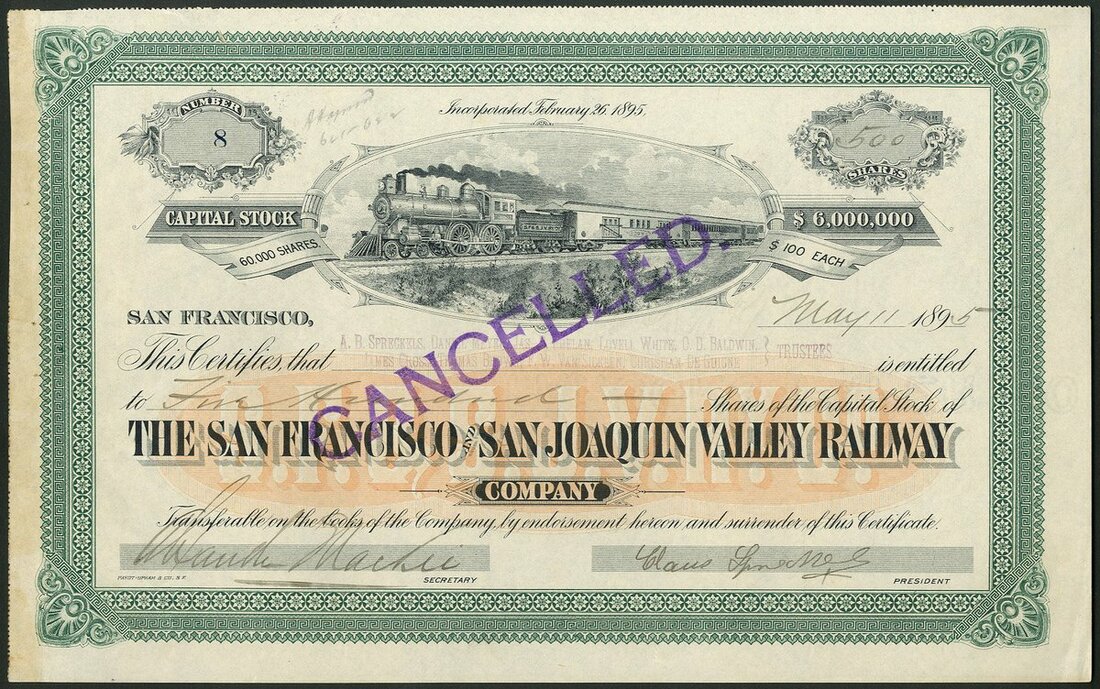 (x) U.S.A.: San Francisco and San Joaquin Valley Railway Co., $100 shares, 189[5], #8, vignette of steam train top centre, decorative border, green and black with orange underprint, cancelled. Signed by Claus Spreckels (industrialist and investor) as President. Spreckels founded the Spreckels Sugar Company in later years. Adhesive residue at left, otherwise EF.