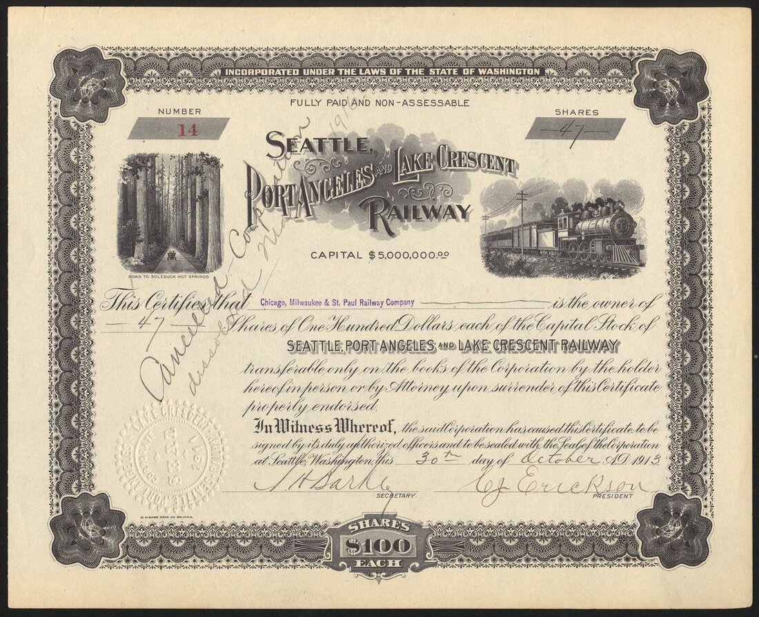 U.S.A.: Seattle, Port Angeles and Lake Crescent Railway (WA), $100 shares, 191[3], #14, steam train at right, 'Road to Soleduck Hot Springs' on left, ornate border, black, cancelled across face. Two small nicks to top edge, otherwise GVF.