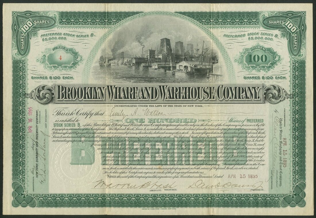 U.S.A.: Brooklyn Wharf and Warehouse Company, 100 B Preferred shares of $100, [1895], #4, attractive vignette of waterfront with warehouses, docks and shipping, green and black. Incorporated in 1894 to consolidate many of the businesses along the Brooklyn waterfront to become the largest private warehousing system in the world. The company developed a rail system and ran 5 Baldwin locomotives. After a sudden decline in business in 1901 the company was acquired by the New York Dock Company, GVF and rare..