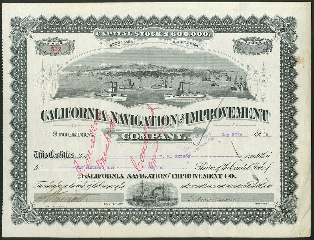 (x) U.S.A.: California Navigation and Improvement Co., $100 shares, 190[9], #532, large shipping scene at top and ornate border, black, cancelled. Formed in 1854 to establish shipping routes in San Francisco Bay and on the Sacramento and San Jacinto Rivers. Small mark on right edge, VF.