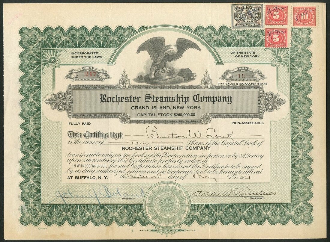 U.S.A.: Rochester Steamship Company, $100 shares, 19[21], #247, eagle vignette, green and black. Incorporated 4th May 1907 to oparate steamships on the Great Lakes. Capital increased from the original $110,000 to $260,000 in 1921 but no further information can be found. VF.