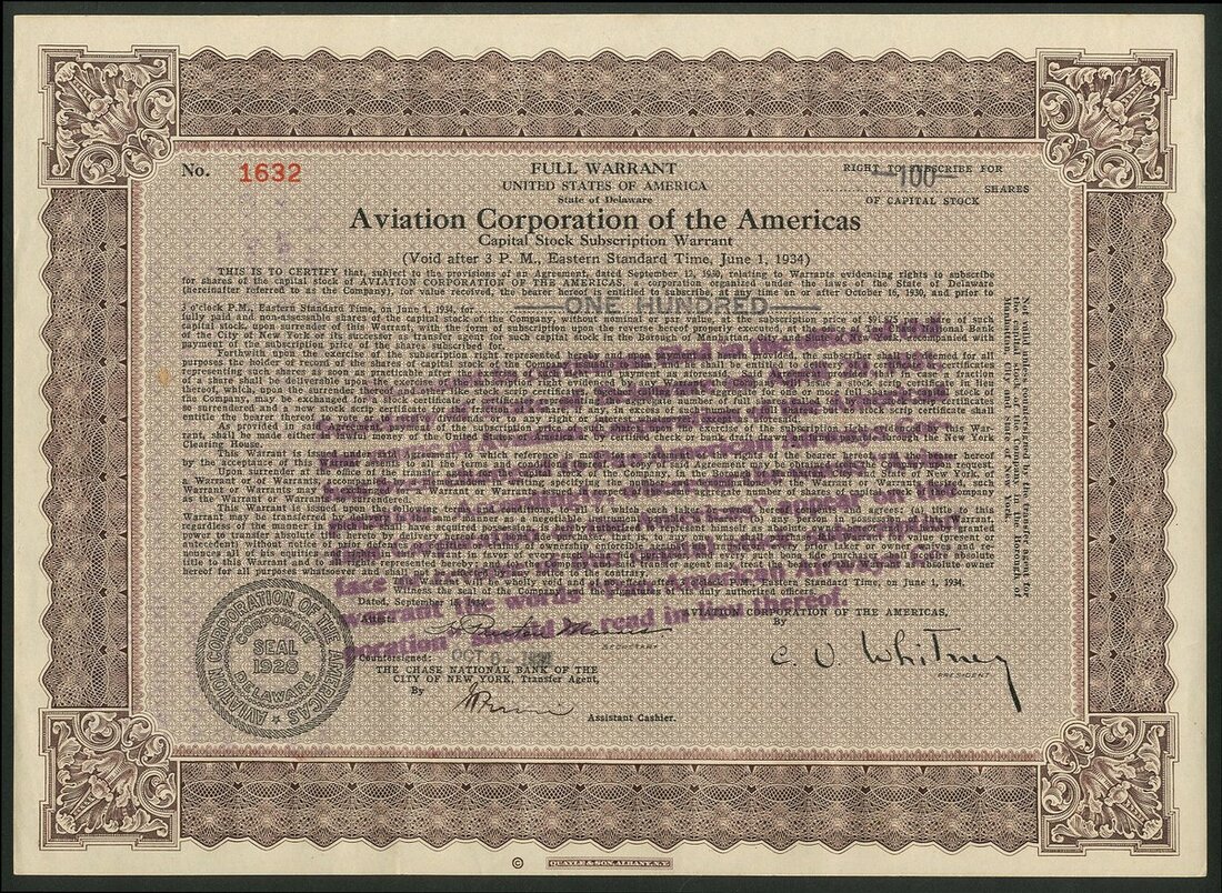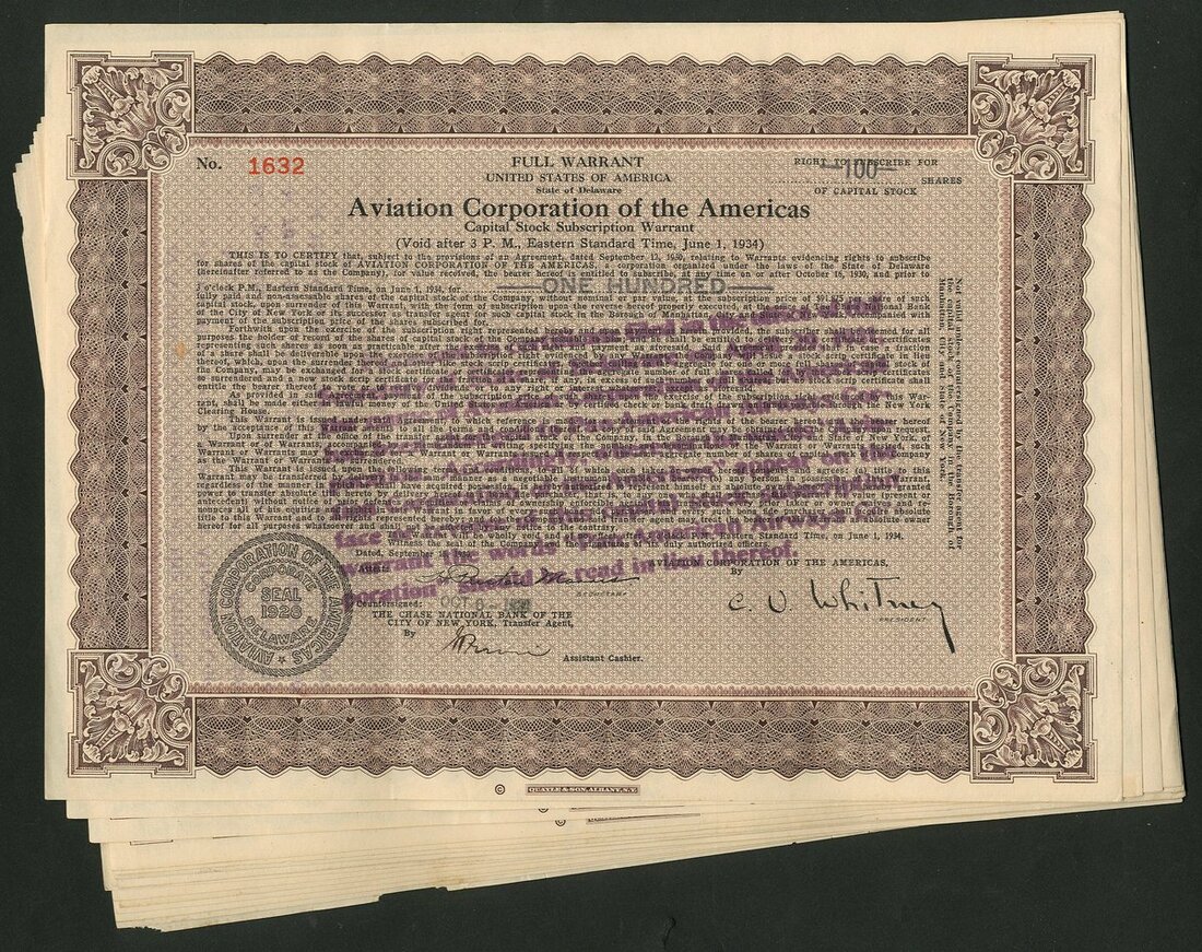 (x) U.S.A.: Aviation Corporation of the Americas, a group of 15 capital stock subscription warrants, [1931], with facsimile signature of C. V. Whitney as President, mauve and black, endorsed on face. Cornelius Vanderbilt Whitney, 1899 - 1992, businessman, philanthropist, film producer and racehorse owner. Co founder of the Guaranty Trust Company and one of the backers of Juan Trippe in this company which soon became Pan American. EF (15).