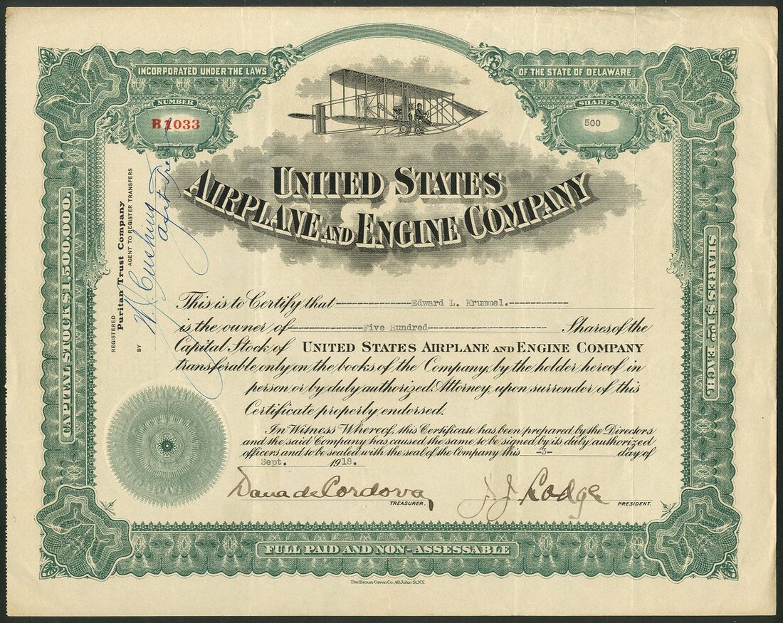 U.S.A.: United States Airplane and Engine Company, Delaware, $1 shares, 19[18], #B1033, lovely early biplane at top, green and black. VF.