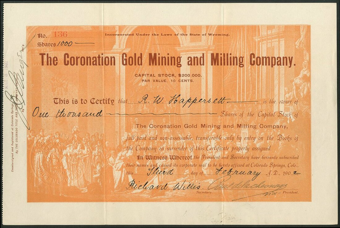 U.S.A.: Coronation Gold Mining and Milling Company (WY), 10 cent shares, Colorado Springs 190[2], #136, orange printing with full sized underprint of Royal Coronation, possibly that of Queen Victoria. Mines in Cripple Creek. Trifolded EF.