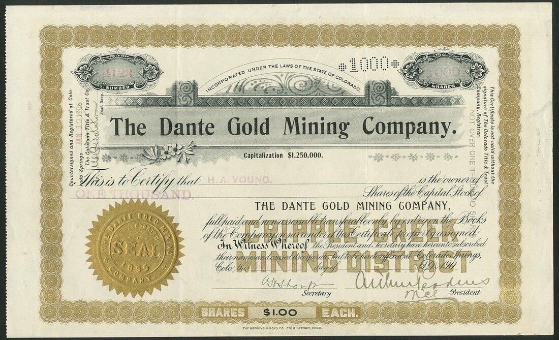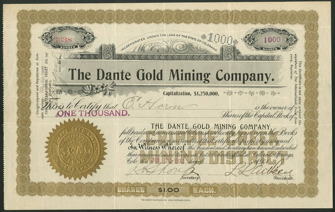U.S.A.: Dante Gold Mining Company (CO), pair of certificates for $1 shares, printing variation on date line, one 1[902] and the other 190[6], both decorative title and border, black and gold, embossed gold seal. Ownes the 10 acre Dante claim on Bull Hill, Cripple Creek, Colorado. Both GVF. (2)
