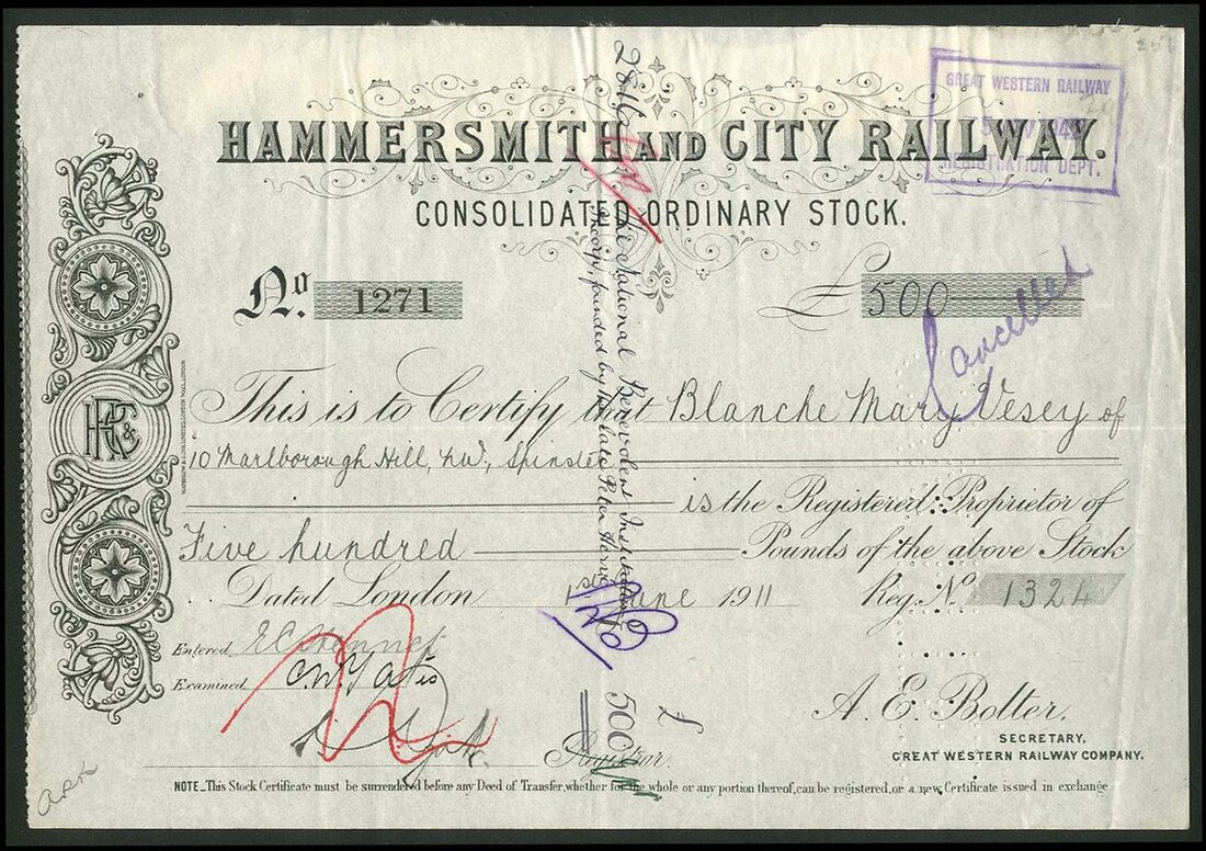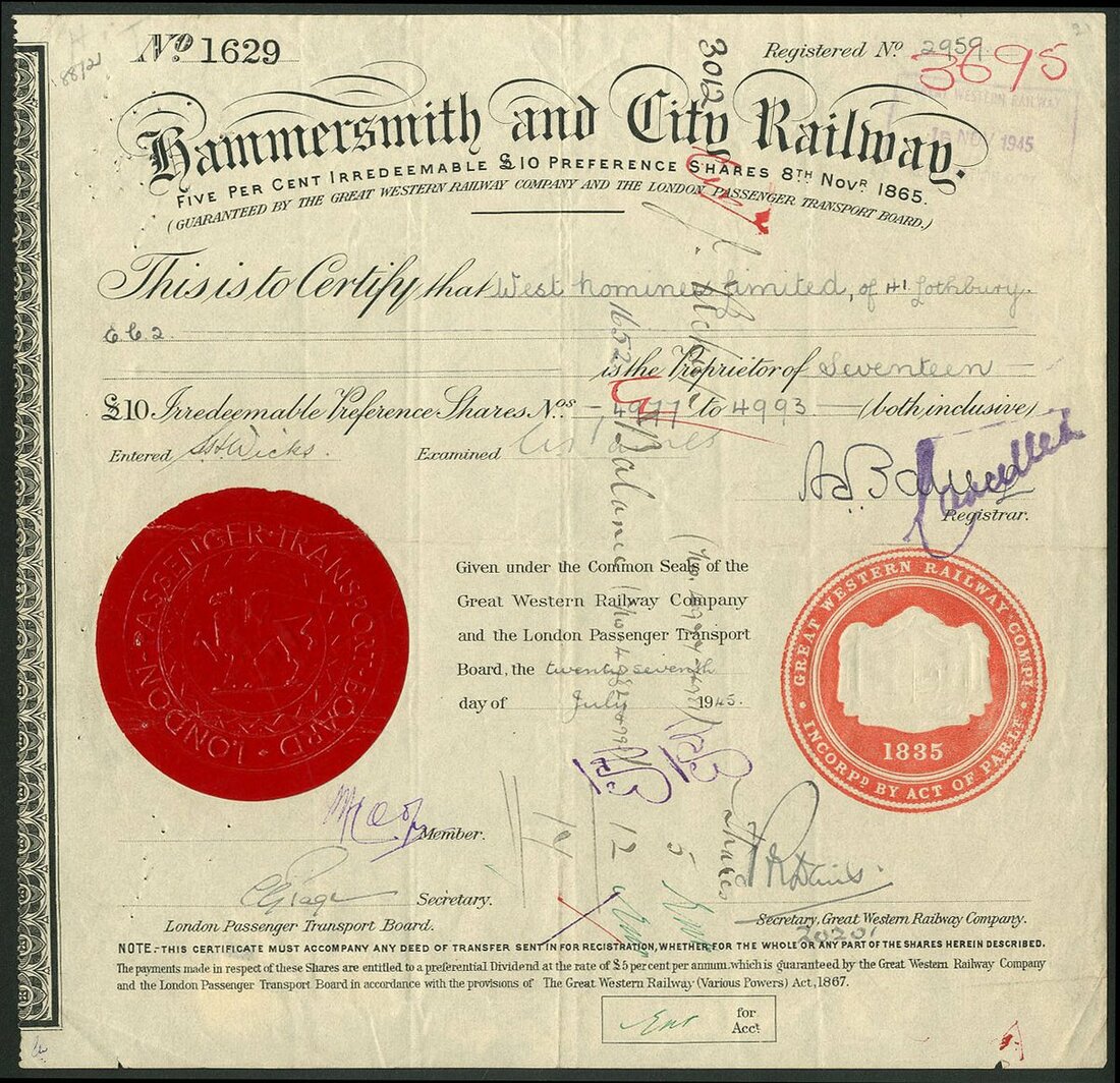 Great Britain: Hammersmith and City Railway, Consolidated Ordinary stock, £[500], 19[11], scrollwork at left, black, printed by Waterlow & Sons. Together with 5% Irredeemable £10 preference shares 1865, dated 19[45], #1629, black, red paper seal, also seal of the Great Western Railway to which it passed. Both cancelled. GVF and VF (2).