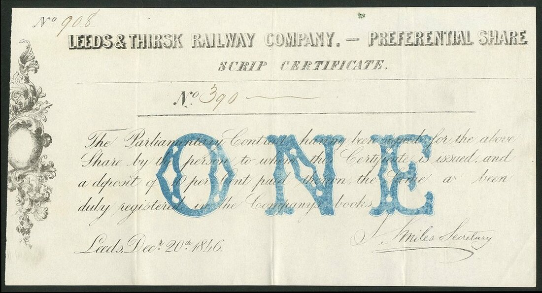 Great Britain: Leeds & Thirsk Railway Company, scrip certificate for 1 preference share, 1846, #390, scrollwork at left, black with blue underprint. GVF.