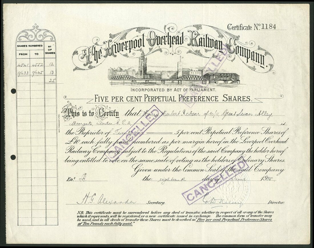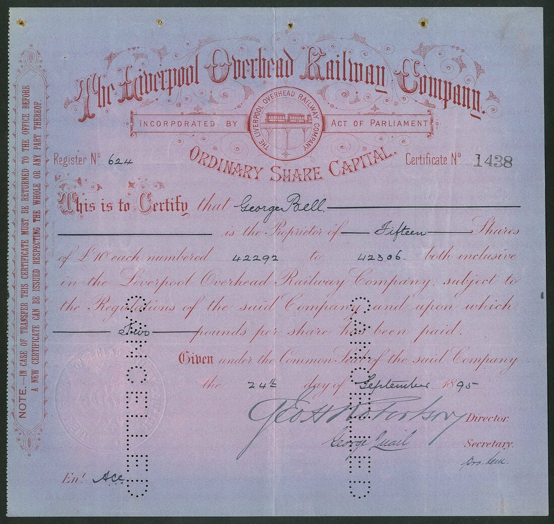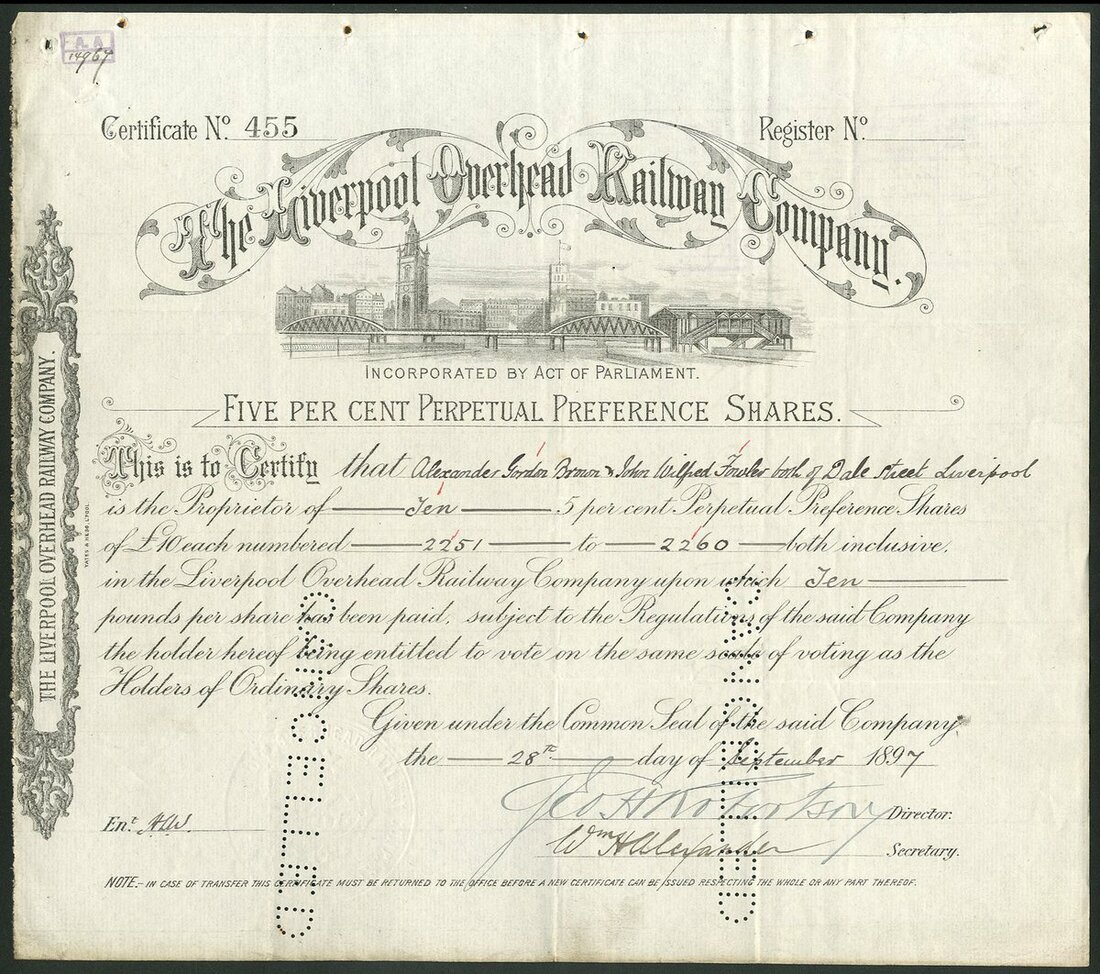 Great Britain: Liverpool Overhead Railway Company, a series of 3 different certificates, ordinary shares, 18[95], #1438, 5% preference shares, 189[7], #455, and another 19[25], #1184. All perforated cancelled. Incorporated on 24th July 1888 and took over the intended work of the earlier Mersey Dock and Harbour Overhead Railway, which was never built. The line was the first electrically powered overhead railway in the world. It was eventually closed in 1957 as it fell outside of the nationalisation scheme of British Railways. Generall VF and better than usual condition (3).