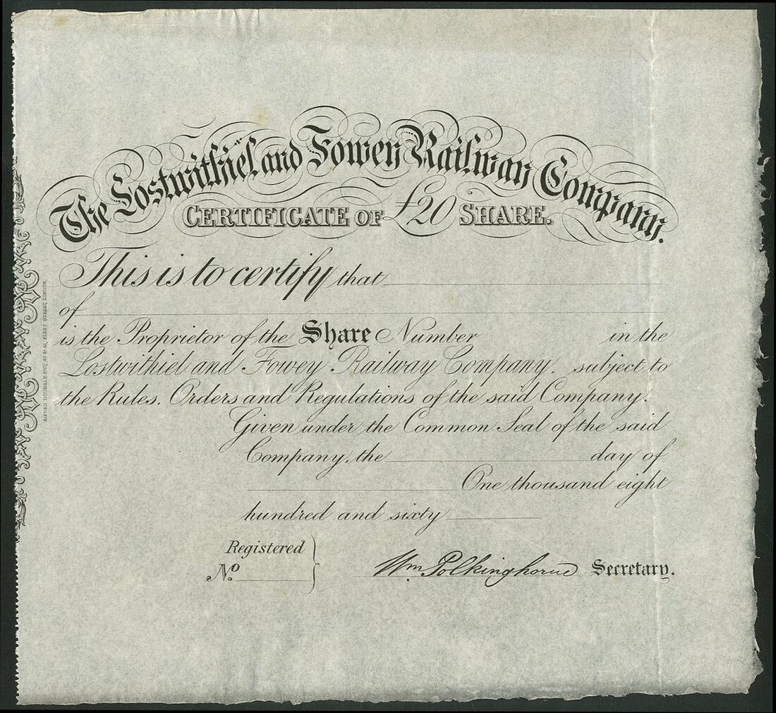 Great Britain: Lostwithiel and Fowey Railway Company, an unissued certificate for £20 share, 186-, not numbered, black, no counterfoil. Incorporated on 30th June 1862. A 5½ mile line linking the towns and connecting with the Cornwall Railway. It opened in 1869 having passed to the latter company in 1862. The line closed in 1877 until 1895 when it was taken over and worked by the Great Western Railway. NEF and rare. No issued certificates seen.