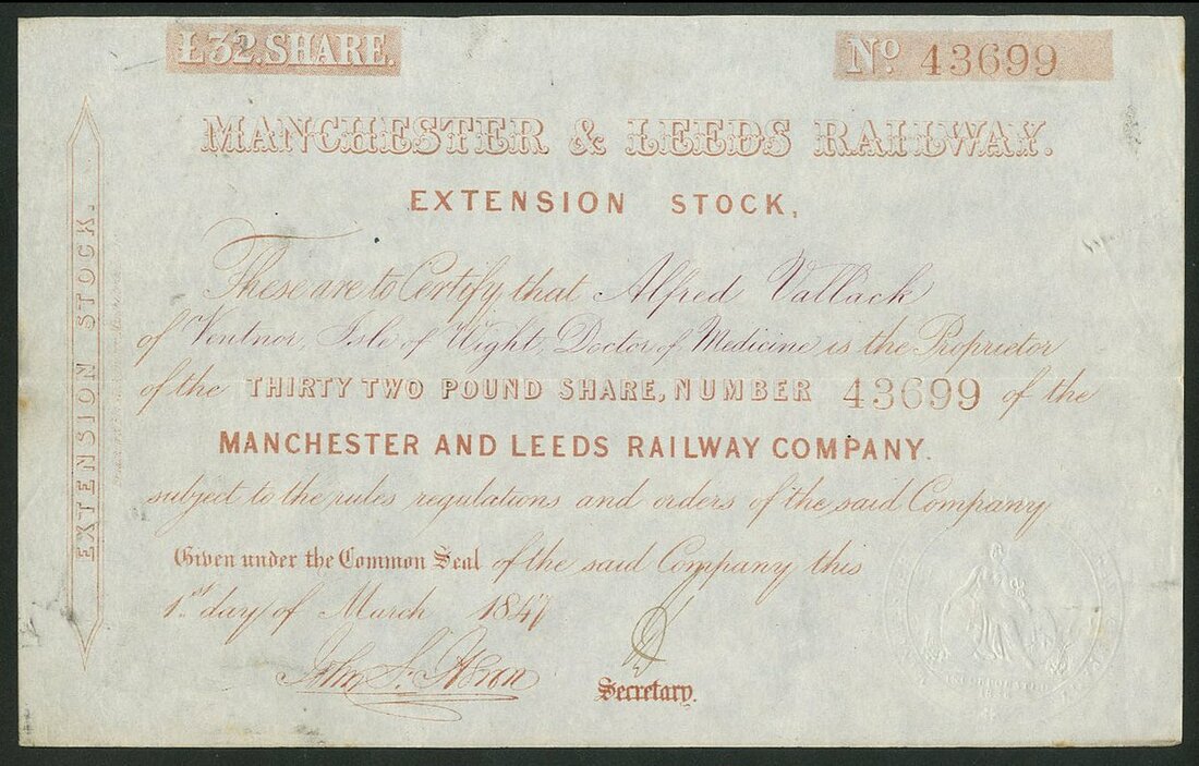 Great Britain: Manchester & Leeds Railway, Extension Stock, £32, 1847, #43699, pale brown, embossed seal. A 50 mile standard gauge line joining the 2 cities. GVF.