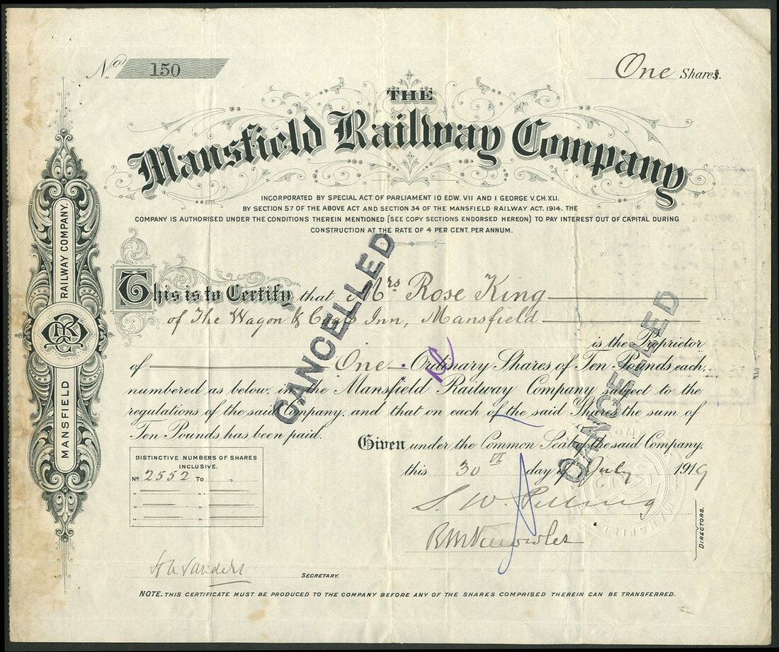 Great Britain: Mansfield Railway Company, £10 ordinary shares, 191[9], #150, scrollwork at left, black. Built to serve the collieries of the Mansfield area. Passed to LNER on grouping in 1923. Glue residue at left, stamped cancelled, F-VF but rare.