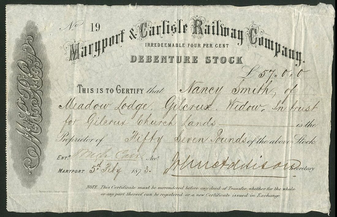 Great Britain: Maryport & Carlisle Railway Company, debenture stock certificate, 187[3], #19, scrollwork at left, black. Incorporated on 12th July 1837. A 28 mile standard gauge line between the towns, built by George Stephenson. It opened in full in 1845 and remained Independent until ‘grouping’ when it joined the London, Midland and Scottish Railway. VF and very rare.
