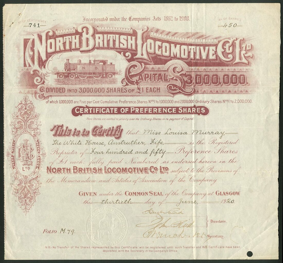 Great Britain: North British Locomotive Co. Ltd., £1 preference shares, 19[20], #741, vignette of 4-4-2 steam locomotive at top, mauve. Created in 1903 by the merger of 3 Glasgow locomotive manufacturers to create the largest locomotive company in Europe. Restructured in 1959 to move from steam to diesel-electric but this proved unsuccessful and the company was put into iquidation in 1962. VF and a scarce early date for this company.
