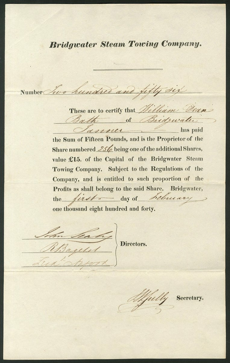 Great Britain: Bridgwater Steam Towing Co., £15 'additional' share, 1840, #256, black. A steam paddle tug operator in the Bristol Channel, controlled by Thomas Sully and his coal interests, that supplemented its income by operating pleasure excursions to Minehead in the early 1850's. The company went into liquidation just before the outbreak of WWI but was revived in 1922 for a few more years. GVF.